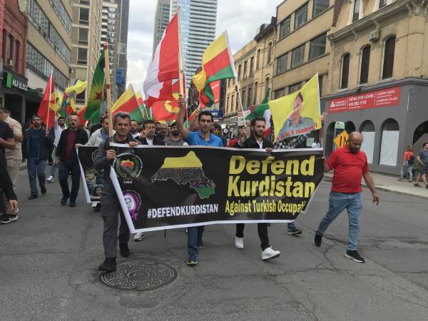 Kurdên li bajêr li dijî êrişên dagirkeriyê yên dewleta Tirk ji Qada Bloor-Yonge heta qada Cîty Hall (Qada Avahiya Şaredariyê) meşiyan.