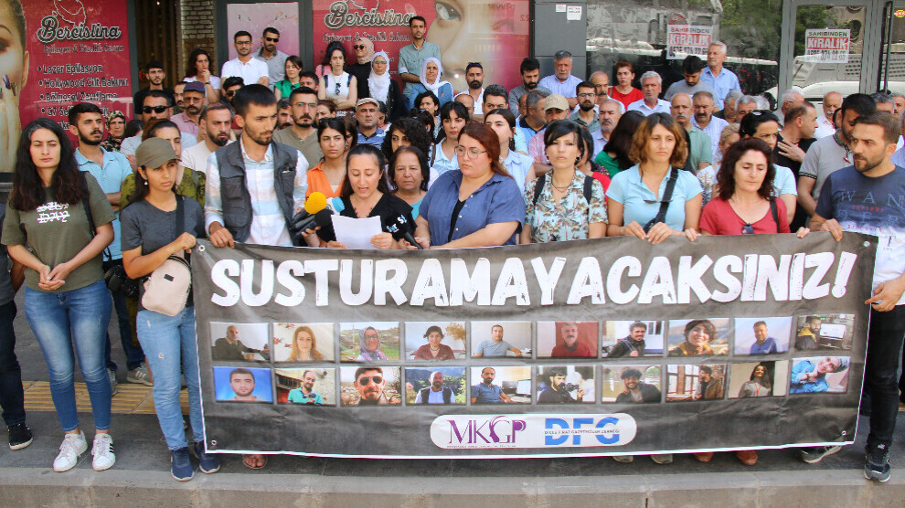 AMED – Bi pêşengiya Komeleya Rojnamegeran a Dîcle Firatê (DFG) û Platforma Rojnamegerên Jin a Mezopotamyayê (MGKP), ji bo 20 jê rojnameger 22 kesên ku polisan bi ser malên wan û cihê karê wan de girtibûn û ew destgîr kiribûn li navçeya Yenîşehîrê ya Amedê li ber derê avahiya JINNEWS’ê ku polisan bi ser wê de jî girtibû daxuyanî dan. HDP, DBP, OHD, MEBYA-DER, TÛAY-DER, MED-DER, TJA, ÎHD, Platforma Ked û Demokrasiyê jî piştgirî dan daxuyaniyê û gelek nûnerên wan û rojnameger tev li daxuyaniyê bûn. Di daxuyaniyê de pankarta wêneyên rojnamegerên hatine destgîrkirin û nivîsa “Hûn ê nikaribin bêdeng bikin” li ser nivîsandî hat vekirin.