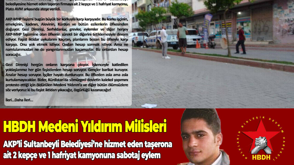 NAVENDA NÛÇEYAN – Milîsên Medenî Yildirim ên Tevgera Şoreşger a Yekbûyî ya Gelan (HBDH) bi daxuyaniyekê ragihand ku di çarçoveya 30’ê Hezîranê Heftiya Fedayîtiyê de di 22’ê Hezîranê de li dijî fîrmaya ku ji Şaredariya Sûltanbeylî ya AKP’î re taşerontiyê dike çalakiya sabotajê li dar xistine. Hat ragihandin ku di encama çalakiyê de 2 kepçe û 1 kamyona axê ya fîrmaya taşeron û pişt avahiya Plato AVM’ê hatiye şewitandin.