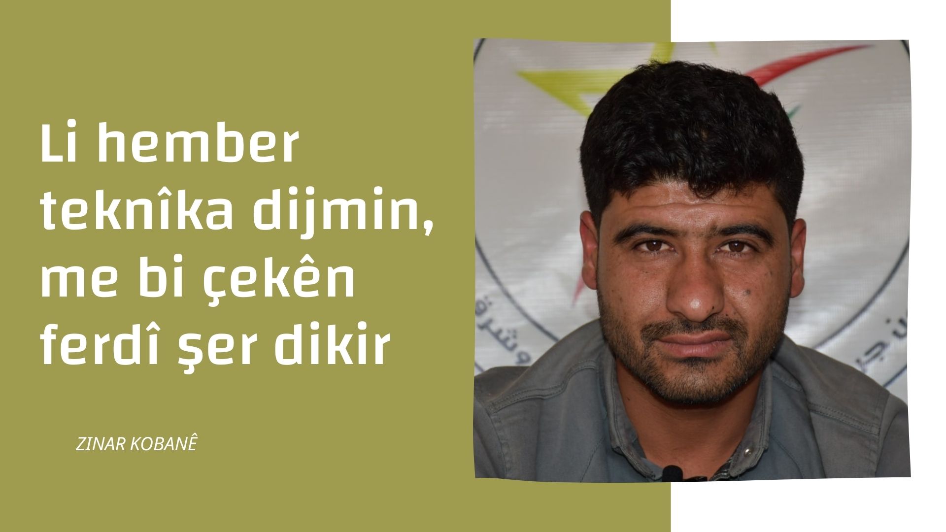 “Wekî tê zanîn di sala 2014’an de şerekî giran hate ser Kobanê, min jî wê demê li taxa rojavayê Kobanê perçeyek di serê xwe de xwar, heya du heftan min her tedawî didît. Şerê ku destpêkiribû di nava 10-15 rojan de, bê navber dijmin çekên herî giran bikar anîn. Ji ber vê jî ez carekê din jî birîndar bûm, ji ber vê ez niha di milê xwe de gazî me. Li hember çekên dijmin yên herî giran me bi qilêşê şer dikir û ji qilêşê girantir BKS’î bû. Di encamê wan şeran de îro li Rojava gelek gazî hene, kesek dema ku di encamê şerê bajaran de birîndar dibe, piştî wê bi wî kesî re fikr û tecrûbeyekî nû çêdibe. Her însanekî gazî hertim ji hêza xwe ya heyî zêdetir kar dike. Di dawiyê de 10’yemîn salvegera şoreşa Rojava li Rêber Apo, şehîdên me, hevalên me yên gazî-birîndar û hevalên di çeperên şer de pîroz dikim.”