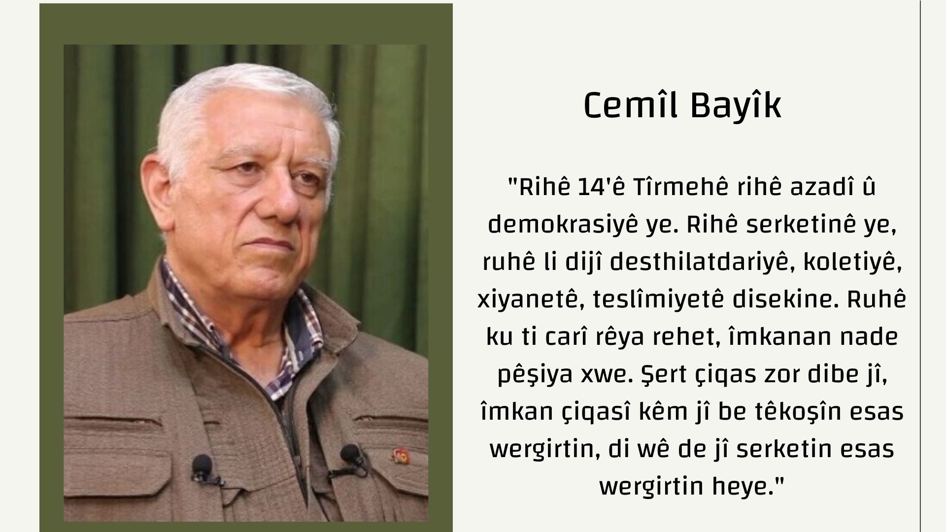 Ruhê 14’ê Tîrmehê ruhê azadî û demokrasiyê ye. Ruhê serketinê ye, ruhê li dijî desthilatdariyê, koletiyê, xiyanetê, teslîmiyetê disekine. Ruhê ku ti carî rêya rehet, îmkanan nade pêşiya xwe. Şert çiqas zor dibe jî, îmkan çiqasî kêm jî be têkoşîn esas wergirtin, di wê de jî serketin esas wergirtin heye. Di wî ruhî de, di her şertî de rabûna bi berpirsyariyê heye. Di her şert û mercî de afirandina çareseriyê ye. Berpirsyarî û çareseriyê bi ser dixîne. Di wî ruhî de îradeyek, dilekî pir mezin heye. Di wî ruhî de, di hevaltiyê de xwe kilîtkirin, ji bo hevaltiyê jiyankirin, ti carî li hevalê xwe xiyanetnekirin, timî hevalê xwe ji xwe mezintdîtin, hurmeta li hevalên xwe heye. Timî hêza çareseriyê bi pêş dixîne. Di wî ruhî de rabûna li ber desthilatdarî û koletiyê heye. Xwe di azadiyê de kilît de dike. Azadiyê jî di azadiya jinê de dibîne. Wê dike bingeha azadiyê. Di wî ruhî de hezkirina li welat, gel, mirovahî û xwezayê heye. Ti carî welatê xwe, xaka xwe naterikîne, gelê xwe naterikîne. Di her şertî de ji bo wan têdikoşe. Têkoşîna ku xizmetê ji gel, însaniyetê, azadiyê, demokrasiyê û welat nake ti carî qebûl nake. Di wî ruhî de ji bo xwe rojekê, kêliyekê jî najî. Xwe ji her alî ve dixe xizmeta gelê xwe, mirovahiyê, partî, hevaltî, Rêber Apo. Vê yekê ji xwe re dike esas û tê de israr dike. Ti carî bi pêşketina razî nabe, bes nabîne. Ji bo xwe sînor danîne. Timî sînoran radike hem ji bo xwe hem ji bo hevalên xwe hem jî ji bo gelê xwe. Ev esas in. Timî di vî ruhî de xweperwerdekirin, nûkirin û paqijkirin heye. Yanî rexne û rexnedayîn esas e. Rûyekî paqij e. Ti carî bêedaletiyê, neheqiyê qebûl nake. Gemariyê qebûl nake. Kêmasî, şaşitiyê, windakirinê qebûl nake. Ruhekî welê ye ku bi temamî bi serketinê ve girêdayî ye. Ev ruh ruhê Rêber Apo ye. Ruhê ku Rêber Apo di nava PKK, PAJK û milîtanên wan de afirandiye. Ji ber ku li derveyî vî ruhî tiştek nabe bersiv ji bo gelê Kurd. Gelê Kurd ji mirinê dernaxe, nade jiyankirin, paşeroja wî gelî nake garantiyê. Rêber Apo ji ber ku rastiya dijmin, rastiya civaka me baş fêhm kiriye li ser wî esasî ev ruh afirandiye. Kes nikare wî ruhî teslîm werbigire. Ew ruh timî ji bo xwe hêzê çêdike. Hêza azadiyê, demokrasiyê, serketinê çêdike. Ji ber wê kes nikare wî ruhî teslîm werbigire. Ew ruh ên ku dixwaze teslîm werbigire bêtesîr dike. Ev jî di jiyanê de derketiye û her kes wê dibîne. Ji ber ku ev tevger tevgereke jin û ciwanan e, li ser taybetmendiyên wan, ruhê wan hatiye avakirin, li ser wê taybetmendî û ruhî dimeşe, ji ber wê bi pêş dikeve, bi ser dikeve.