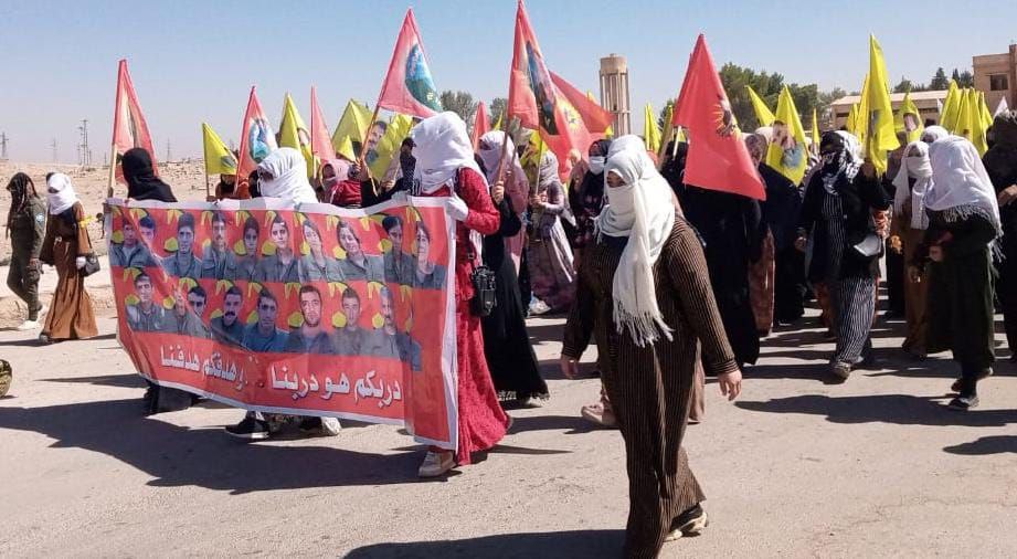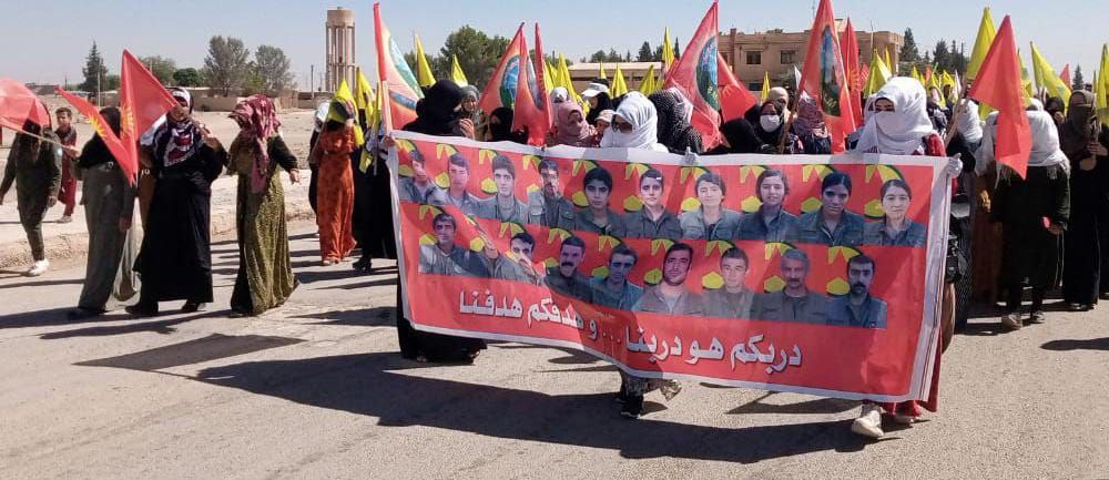 QAMIŞLO – Duh di pêşengtiya ciwanan de bi sedan şêniyên navçeya Til Hemîs bi armanca şermezar kirina êrîşên dewleta Tirk ya dagirker ên li ser herêmên Bakur- Rojhilatê Sûriyeyê û bi armanca piştgirî dayîna Hêzên Sûriyeya Demokratîk meşekê li darxistin û gotin, “Bi ruhê berxwedana şehîdan û bi ruhê berxwedana jinan, em dîsa piştgiriya xwe ya bi Hêzên Sûriya Demoqratîk re nû dikin. Yên ku li dijî çeteyên DAIŞ’ê şer kirin û ew têkbirin, niha jî dîsa xaka Bakur-Rojhilatê Sûriyeyê, ji êrîşên dewleta Tirk û çeteyên wê ve diparêzin.