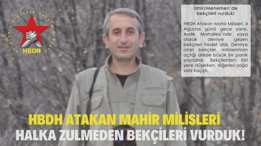 Di daxuyaniyê de ev tişt hate diyar kirin; “Me li Menemena Îzmîrê li notirvanan da. Milîsên Atakan Mahîr ên HBDH’ê di 4’ê Tebaxê de bi şev li Taxa Asirlikê li notirvanên bi peyatî di dewriyeyê de bûn da. Ji ber lêdana çekdarî ya milîsên me notirvan ketin nav panîkê. Notirvanek kete erdê û yên din jî reviyan. Wesayîtên polîsan û ambûlans hatin qadê û milîsên me piştî çalakiyê bi selametî ji qadê derketin.”