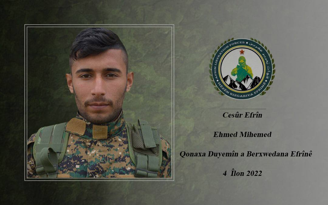 NAVENDA NÛÇEYAN – Hêzên Rizgariya Efrînê (HRE) bi daxuyaniyeke nivîskî da zanîn ku şervanê wan Cesûr Efrîn (Ehmed Mihemed) roja 4’ê Îlonê dema li ser erka xwe bû, şehîd bûye.