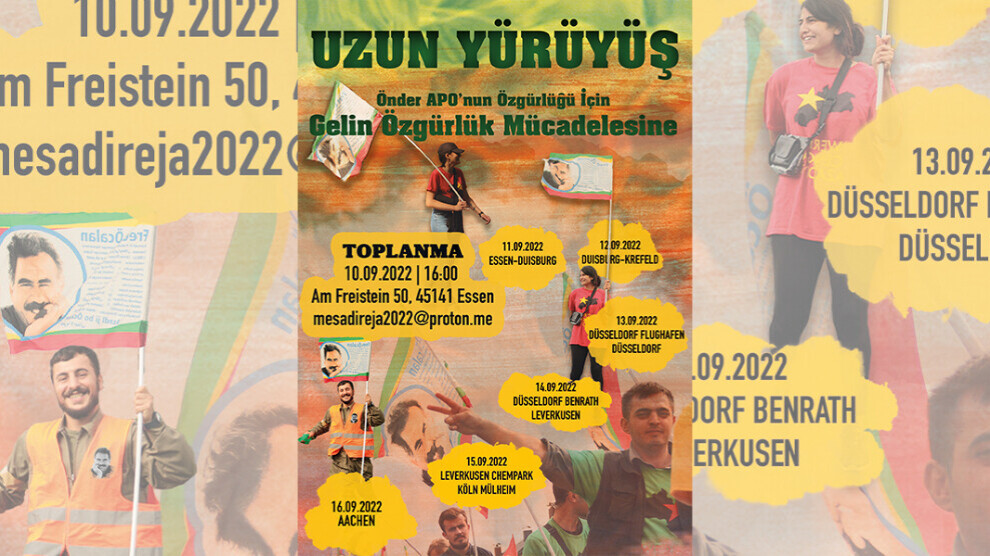 Weke ciwanên Kurd ên li Ewropayê nabe ku em li hemberî vê bêdeng bimînin û qebûl bikin. Li ser vê bingehê çalakiya me ya Meşa Dirêj a navbera 11-16’ê Îlonê ya ji bajarê Essenê heta Aachenê, wê bi daxwaza azadiya Rêber Apo pêk were. Em bang li ciwanên Kurd û enternasyonalîst ên li Ewropayê dikin ku bi seferberî tevlî çalakiyê bibin û daxwaza azadiya Rêber Apo bînin ziman.”