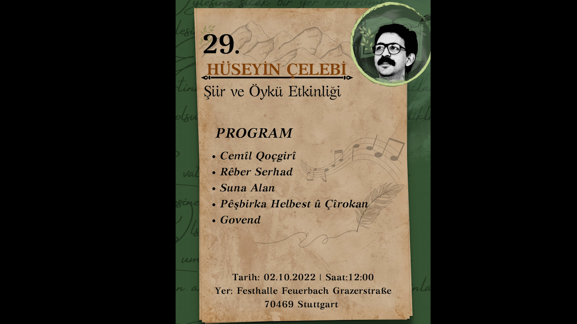 NAVENDA NÛÇEYAN – Pêşbirka Helbest û Çîrokê ya Huseyîn Çelebî ku her sal bi pêşengiya JXK û YXK’ê tê lidarxistin, wê îsal li bajarê Elmanya Stûttgartê bê lidarxistin.