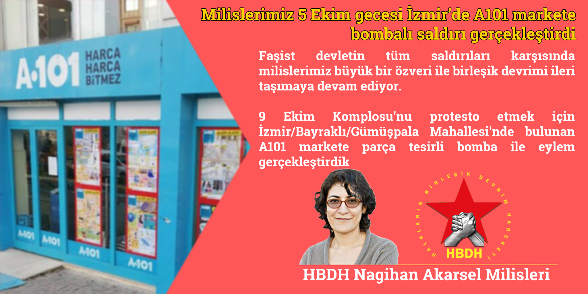 Weke Milîsên Nagîhan Akarsel ên HBDH’ê li taxa Gumuşpala ya navçeya Bayrakli ya Îzmîrê li hemberî marketa A101 çalakiyeke bombeyî lidar xistin. Di encamê de xisareke mezin a madî li marketê bû.”