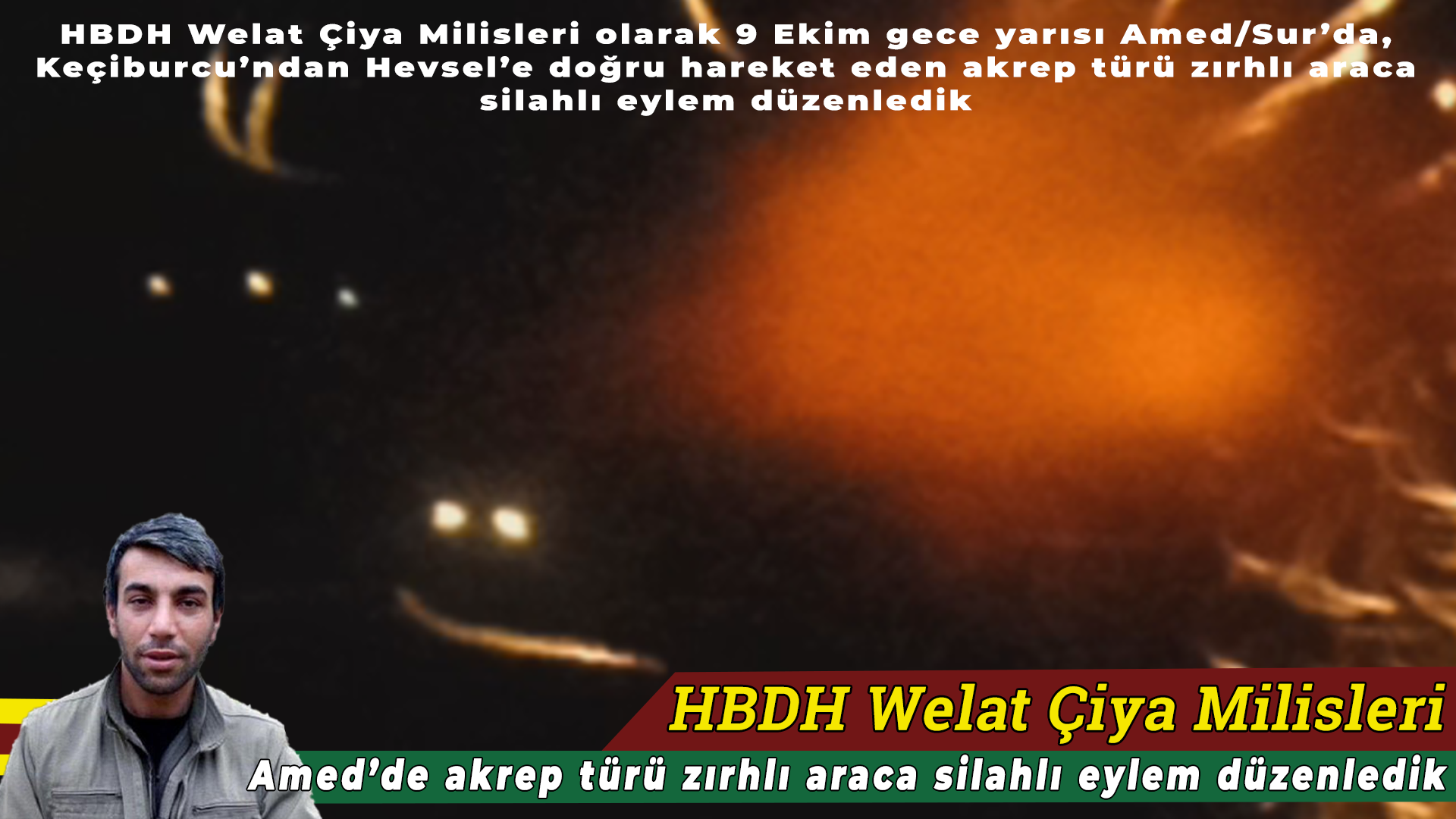 Di daxuyaniyê de hate gotin, “Şeva 9’ê Cotmehê li Amed/Sûrê, li hemberî wesayiteke zirxî ya bi tîpa Akrep a ji Keçîbûrcû diçû Hewselê, me çalakiyeke çekdarî kirin. Di encamê de wesayita dijmin bêbandor bû. Piştî demekê dijmin xwest bi droneyê keşfê bike. Milîsên me ev drone jî xistin.