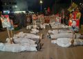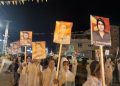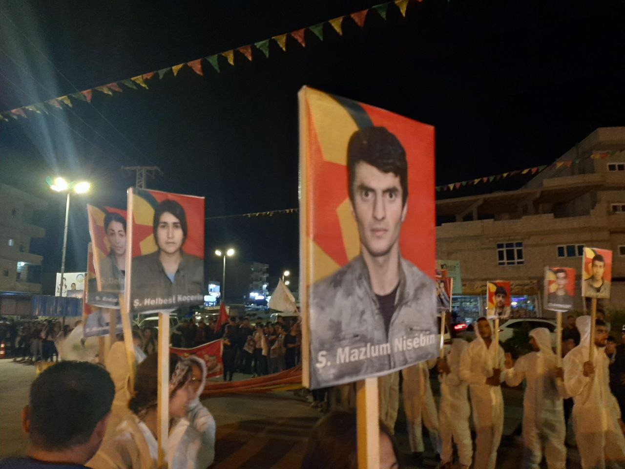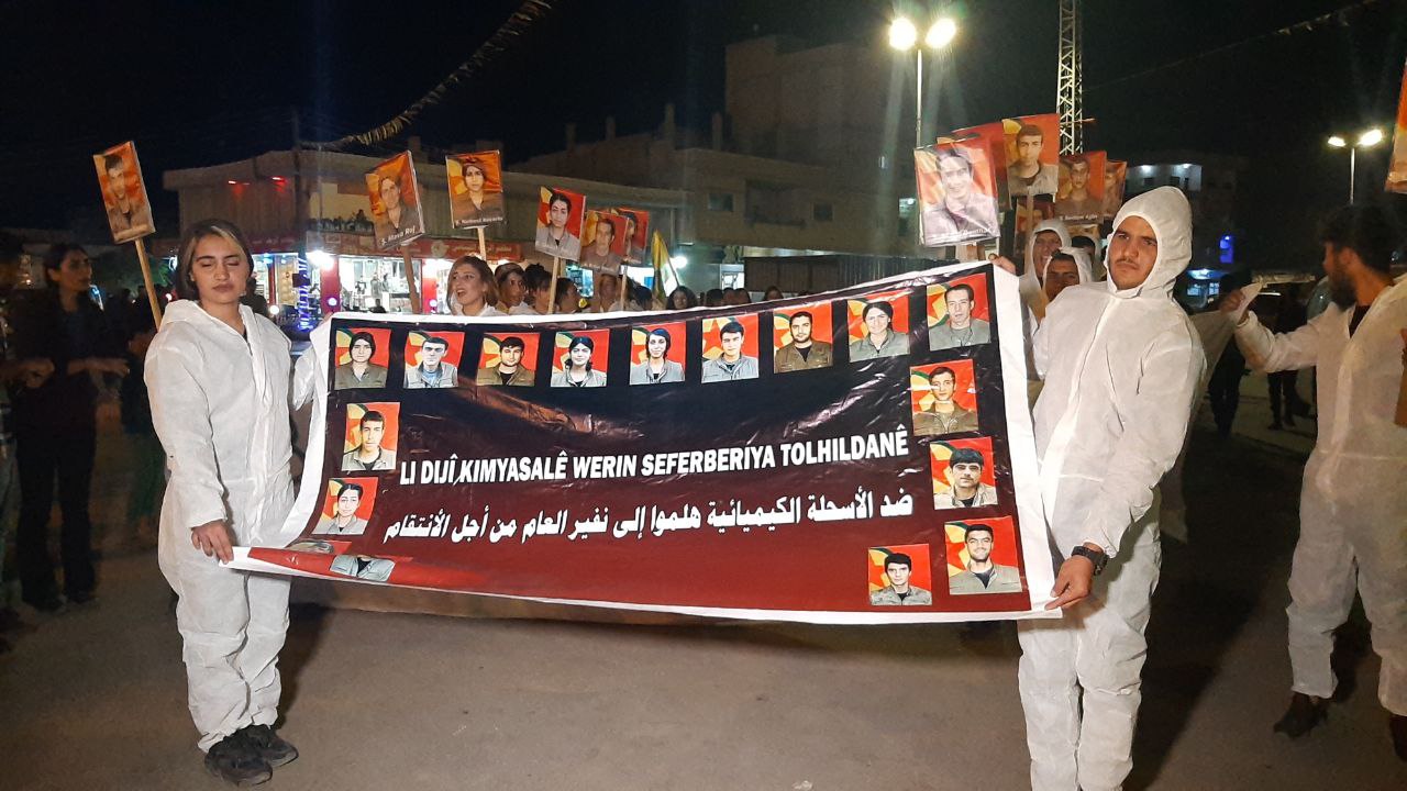 Meş bi qîrkirina silogan û hildana wêneyên şehîdan ji Qada Jina Azad destpêkir û heta Parka 19’ê Tîrmehê dom kir. Ciwanên ku cilên li dijî bikaranîna çekên qedexe û kîmyewî li xwe kiribûn bê navber siloganên ‘Bijî Berxwedana Gerîla’, ‘Şehîd Namirin’ û wêneyên 17 gerîlayên bi kîmyayê şehîd bibûn, hildan.