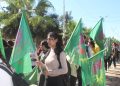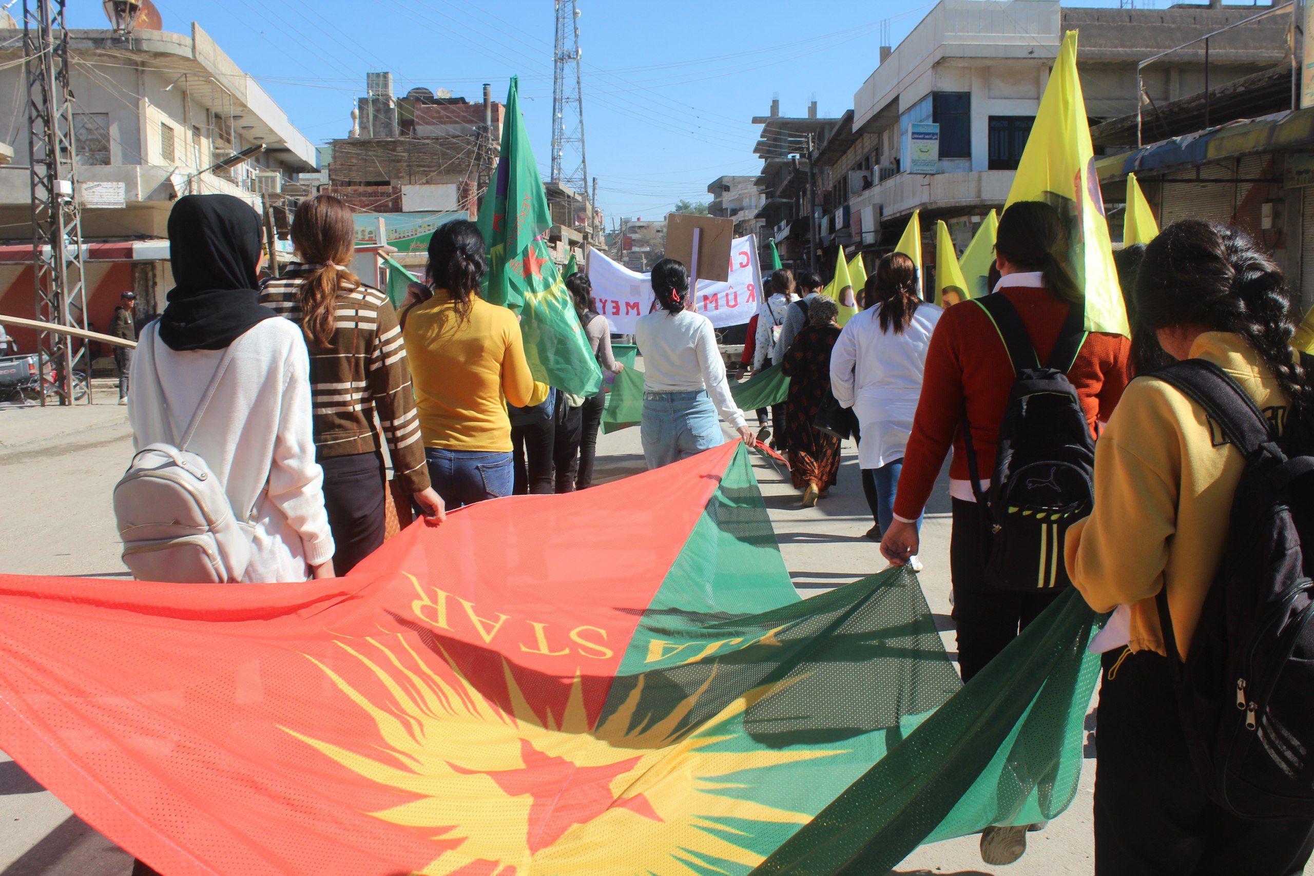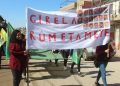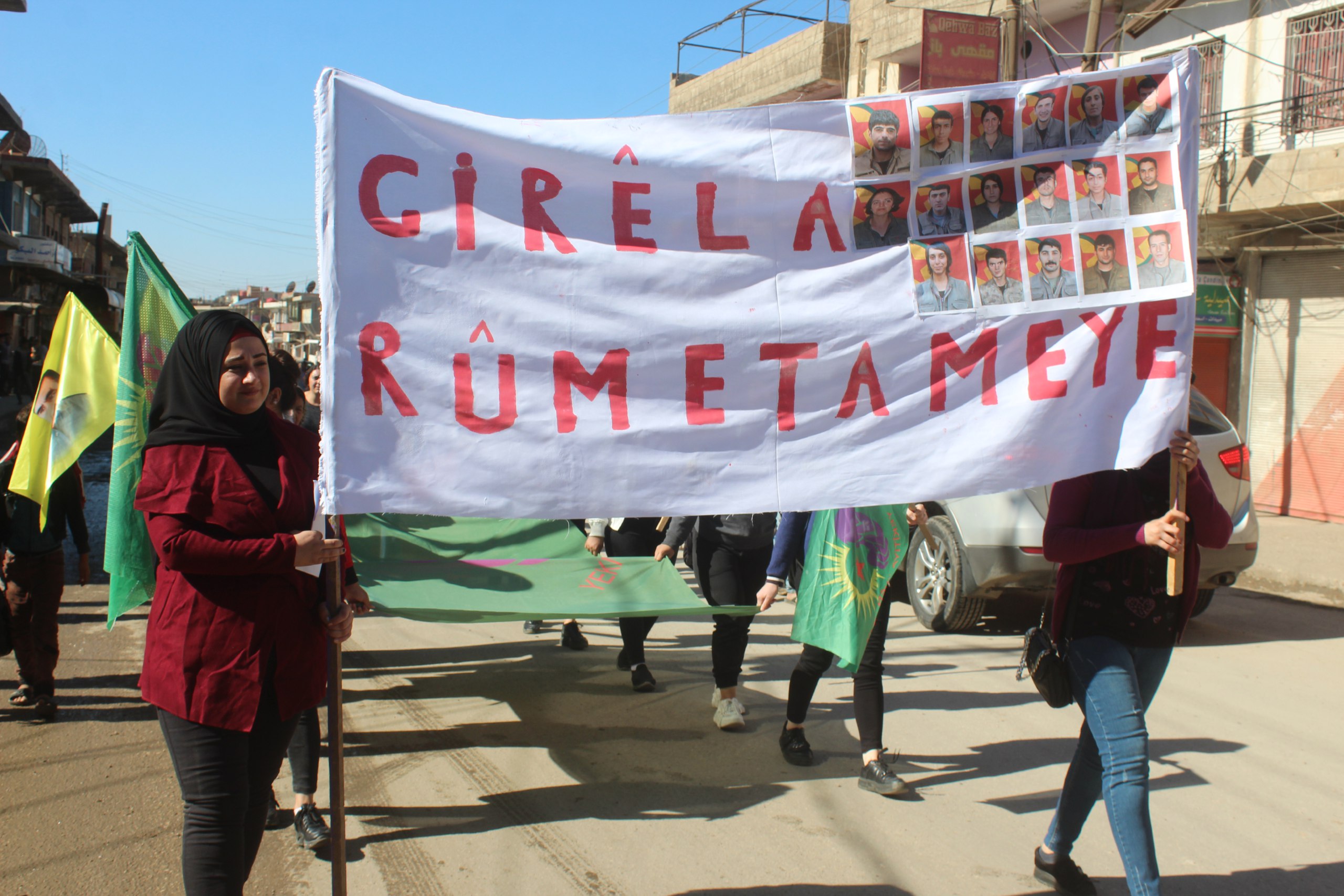 Di çalakiyê de jinên ciwan pankartên ku li ser wê “Gerîla Rûmeta Me Ye” hatiye nivîsandin bilind kiribûn. Heman demê de tevahî jinên ciwan û ciwanên ku beşdarî meşê bibûn bi berzkirina siloganan heya cihê kombûyînê çûn.