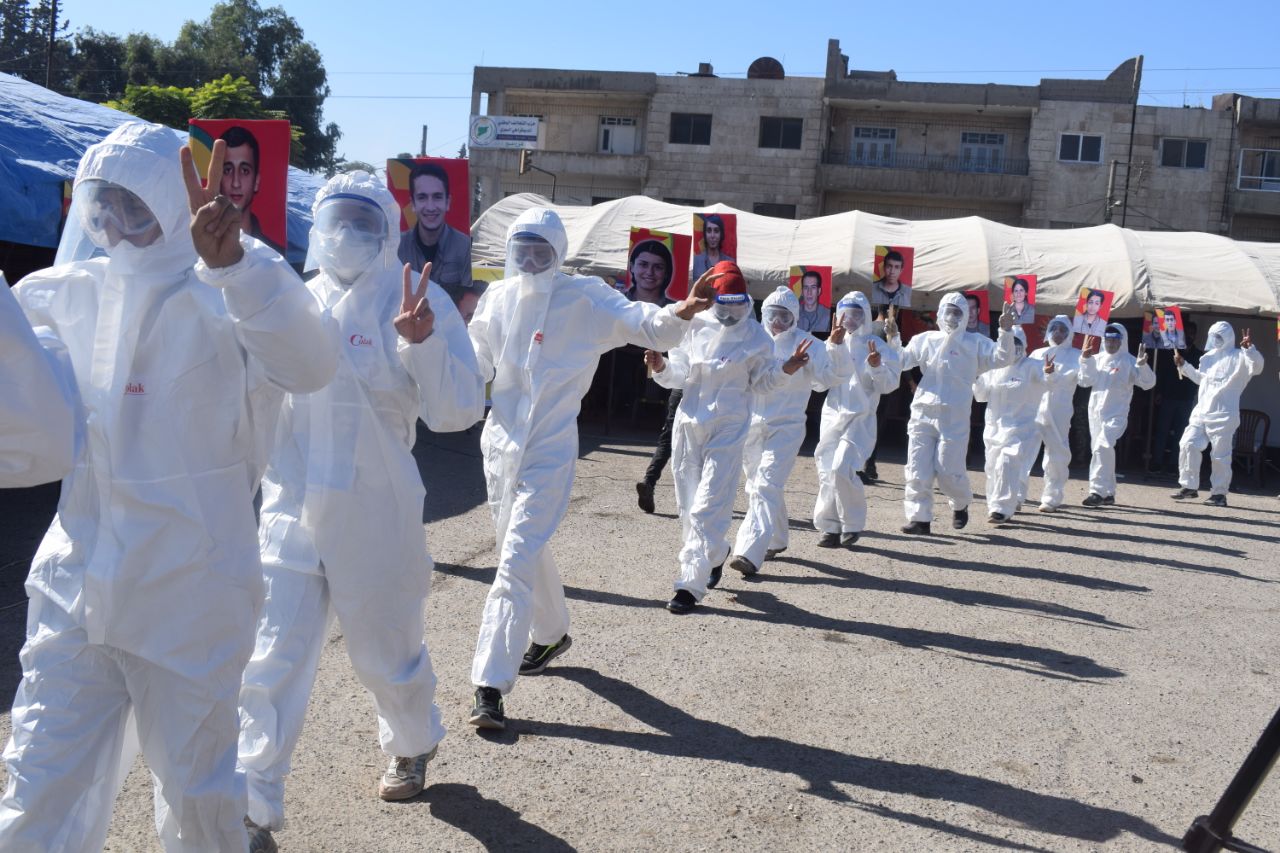 Bi diruşma “Werin Cenga azadiyê” şêniyên Minbicê êrişên dewleta Tirk a dagirker ên li dijî Herêmên Parastinê yên Medyayê û bikaranîna çekên kîmyewî li dijî gerîla ji bin konê çalakiyê ku Tevgera Ciwanên Şoreşger a Sûriyê ya Minbicê li naverasta bajêr li dar xistiye, şermezar kirin.