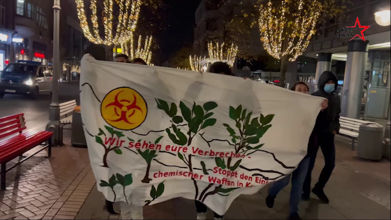 Çalakvanan li pêşiya konsolosxaneyê bi qasî 10 deqîqeyan rê trafîkê re girtin û pankarta ‘Gaza kîmyewî neavêje Kurdistanê’ vekirin.