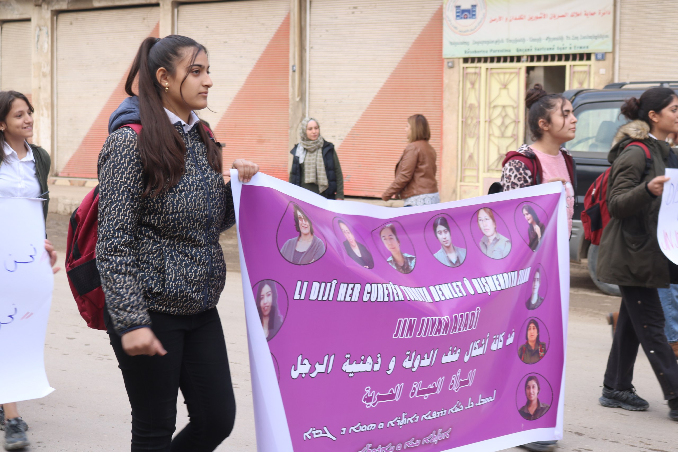 Jinên ciwan ên ku beşdarî we meşe bûne, ala Yekitiya Jinên Ciwan, YJA-Strare hildan. Ji bilî wê pankartên bi nivîsên “Tundiya li dijî jinan sûcek li dijî mirovahiyê ye” û”Li dijî zihniyeta baviksalarî ya paşverû tê bikoşin” hatin vekirin.