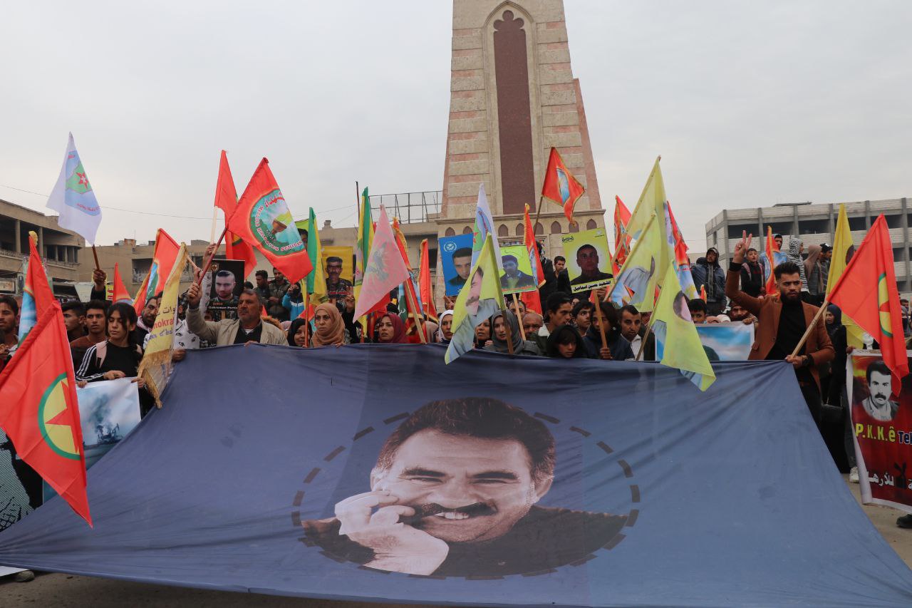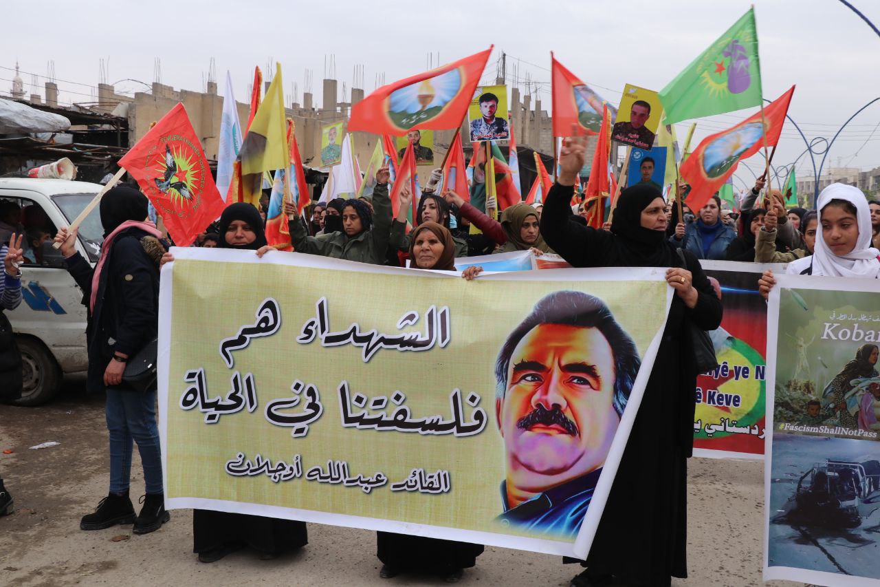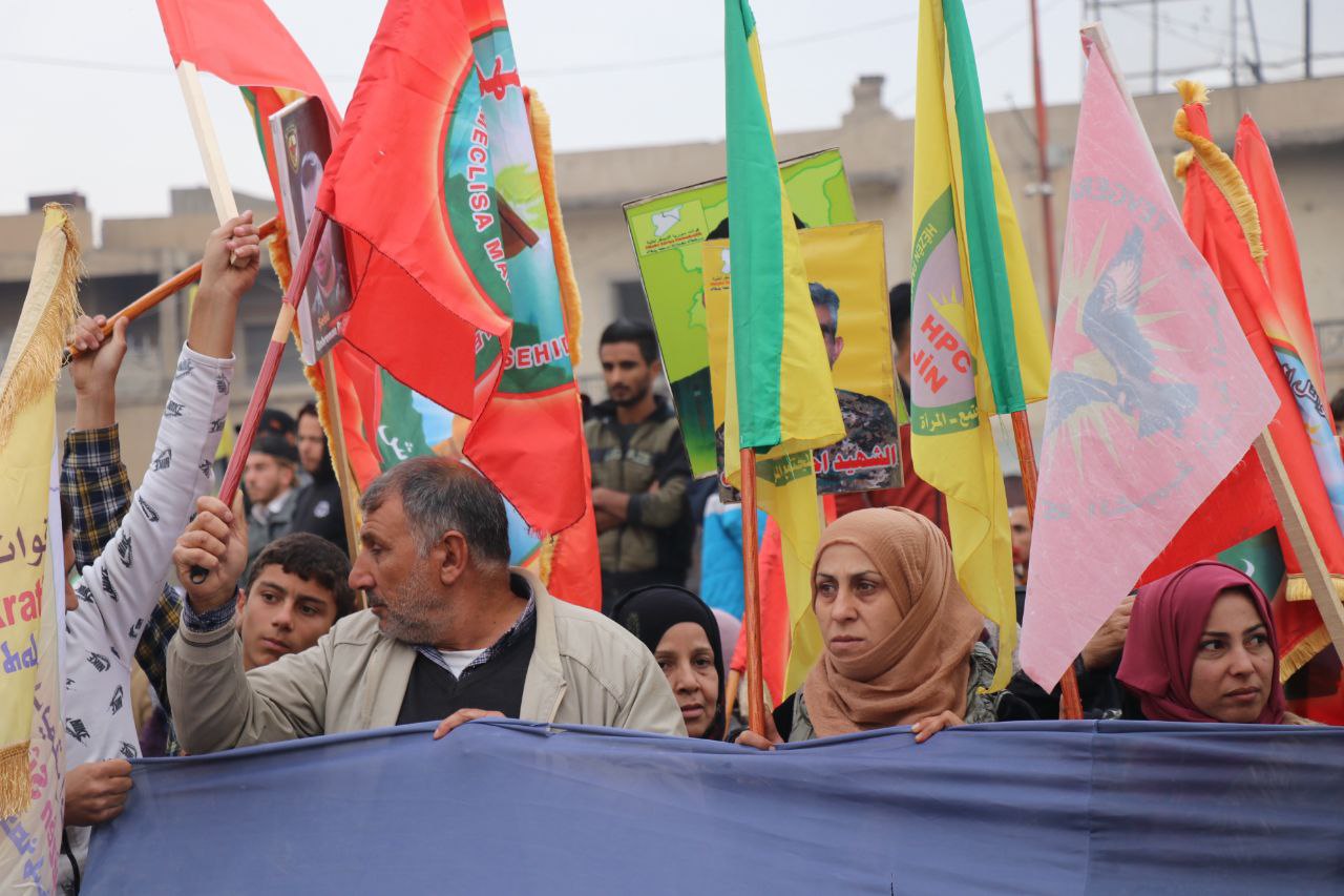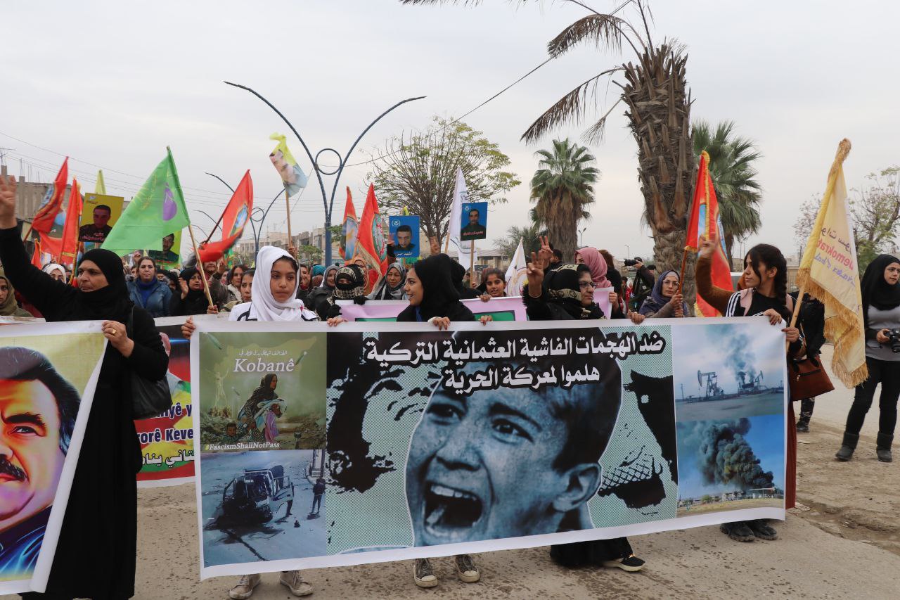 Xwepêşandan ber bi Çerxerêya Saetê ya li naverasta Reqayê bi diruşmên “hilweşa faşîsta Tirk”, “Bijî PKK′ê”, “Bijî QSD′ê” û “Bijî hêzên gerîla” dest pê kir.