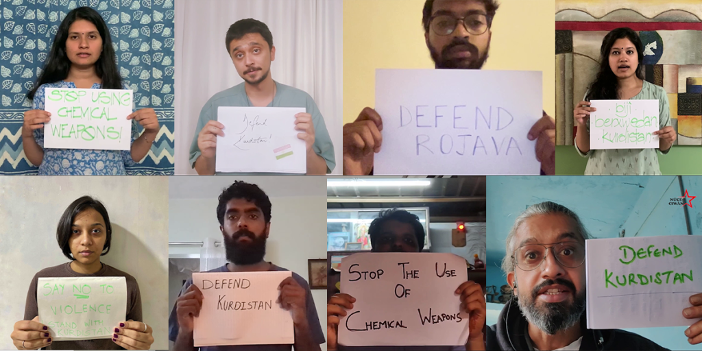 Em ji Hindistanê peyama hevgirtinê dişînin Kurdistanê. Bombebarana sivîlan, hêzên parastinê, nexweşxane, ambûlans û pêdiviyên xwarinê, bikaranîna çekên kîmyewî, binçavkirin û kuştina xwepêşanderan nîşan dide ku ev êrîşên li dijî jiyana azad û demokrasiyê ne. Em dibêjin: Em li tenişta Kurdistanê ne!