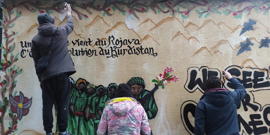 “Di 30’ê Mijdara 2022’an de bi boneya bikaranîna çekên kîmyewî û destpêkirina erîşa dagirkeriyê ya li hemberê Rojava, li dijî kîmyabarana li Kurdistanê, me ev resim li Parîsê (kolana Henri Noguères) çêkir.