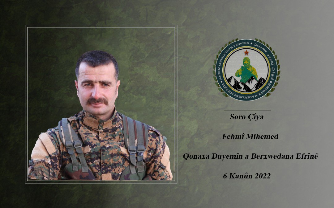“Di roja 6’ê Kanunê de hevrêyê me Fehmî Mihemed bi nasnav Soro Çiya dema li ser erka xwe bû, di encama qezayekê de gihîşt şehadetê.
