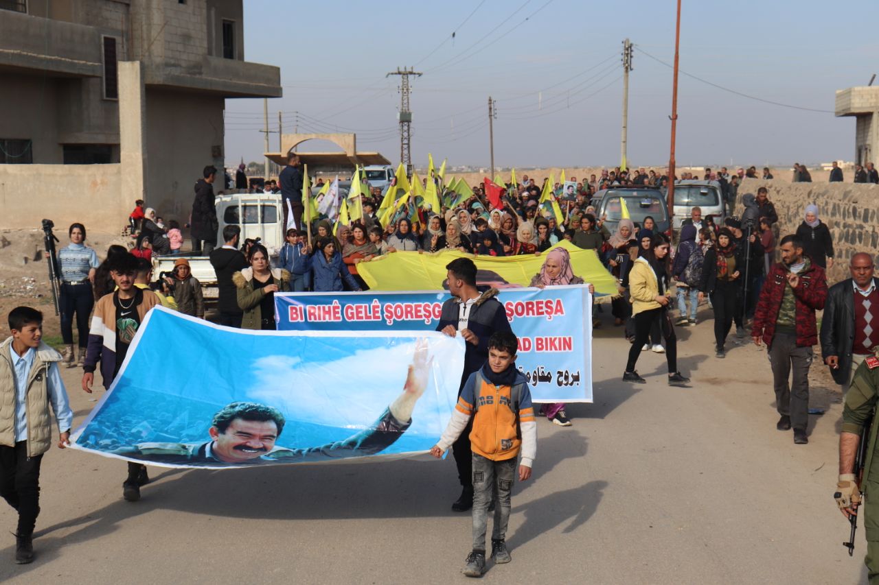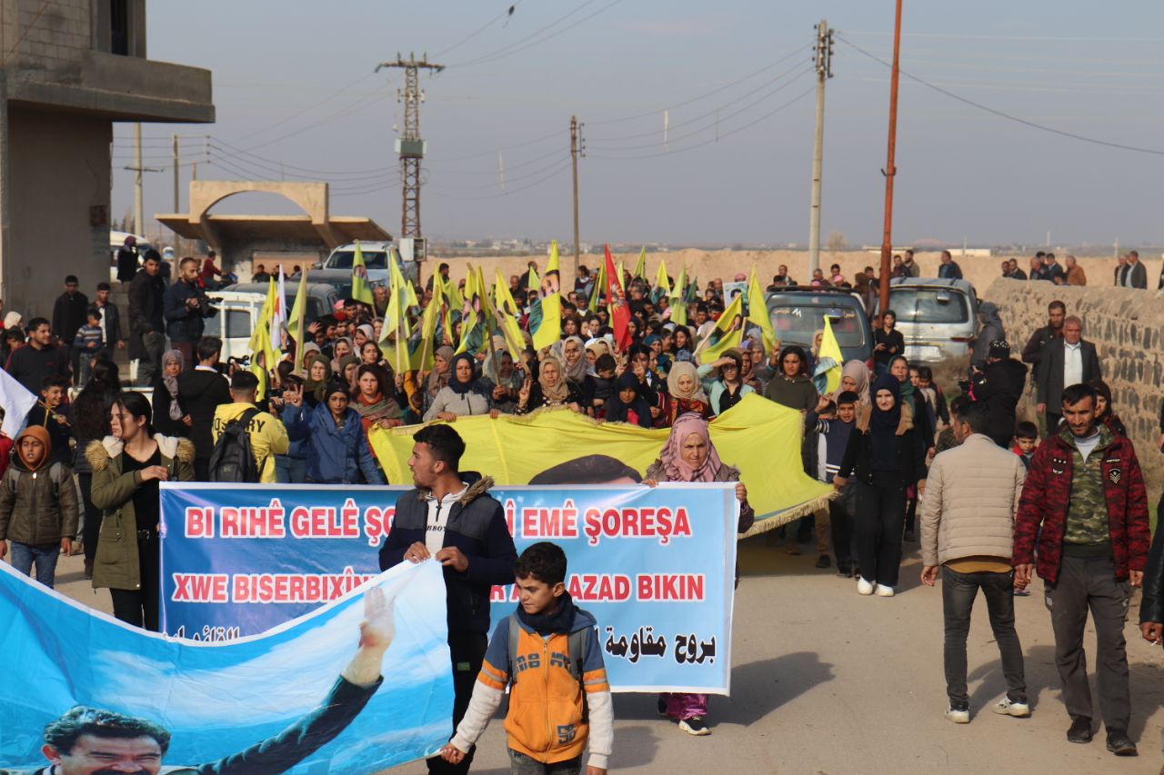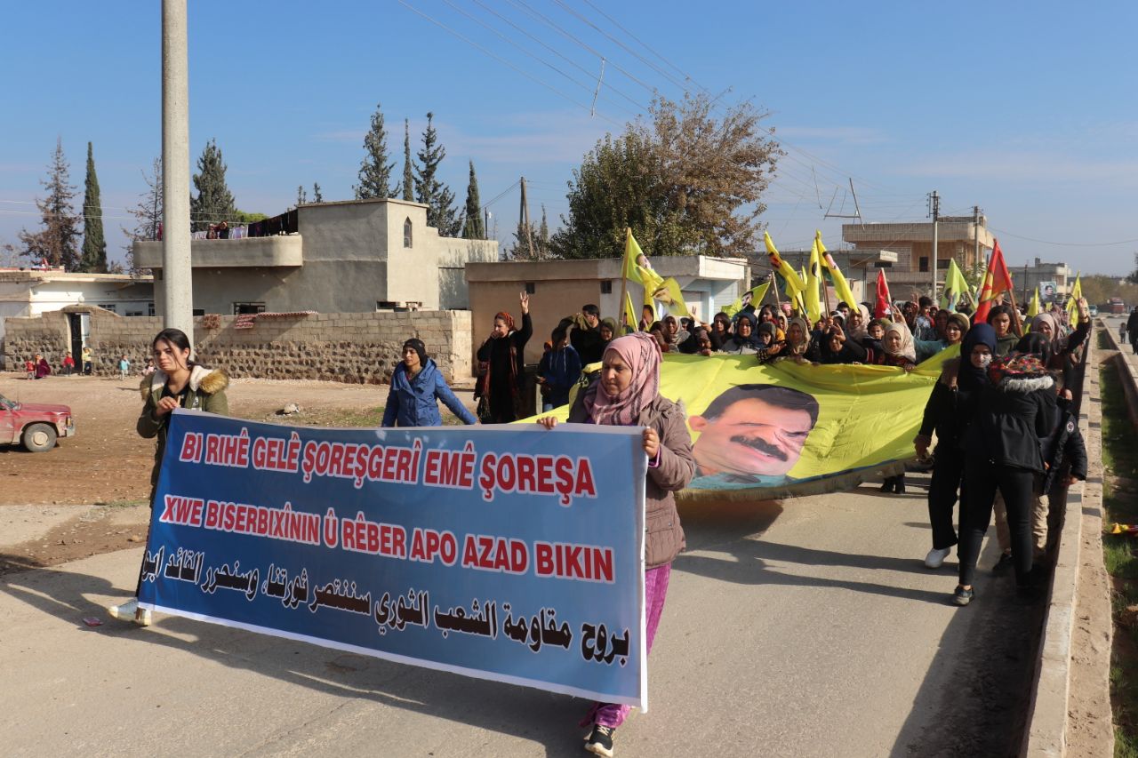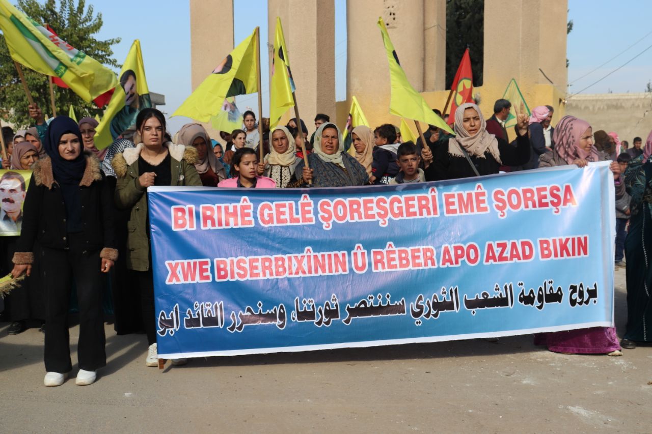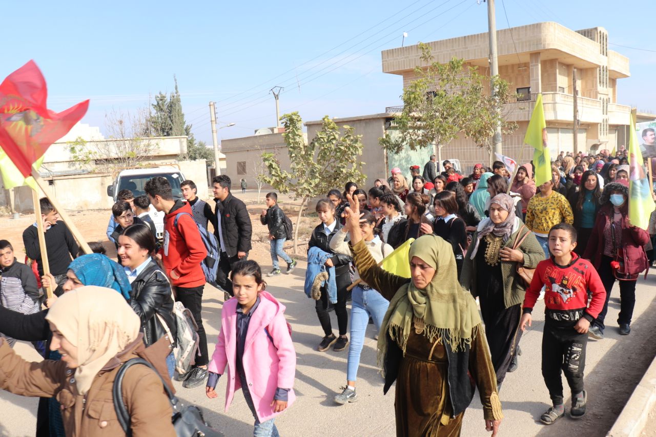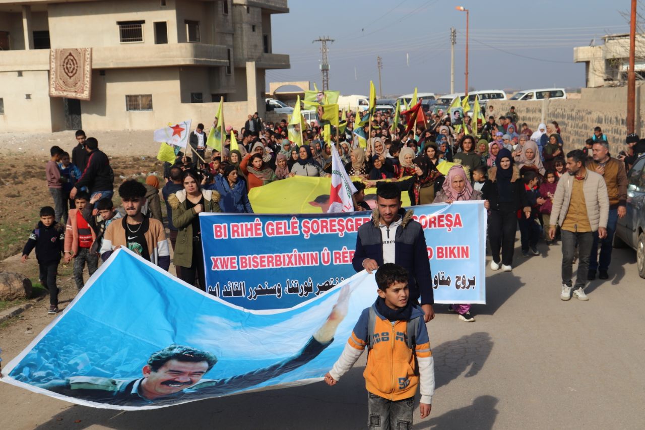 KOBANÊ- Îro li bajarê Kobanê navçeya Şêranê Tevgera Ciwanên Şoreşger û Yekitiya Jinên Ciwan li hemberî tecrîda girankirî liser Rêber Apo meşek lidarxistin.