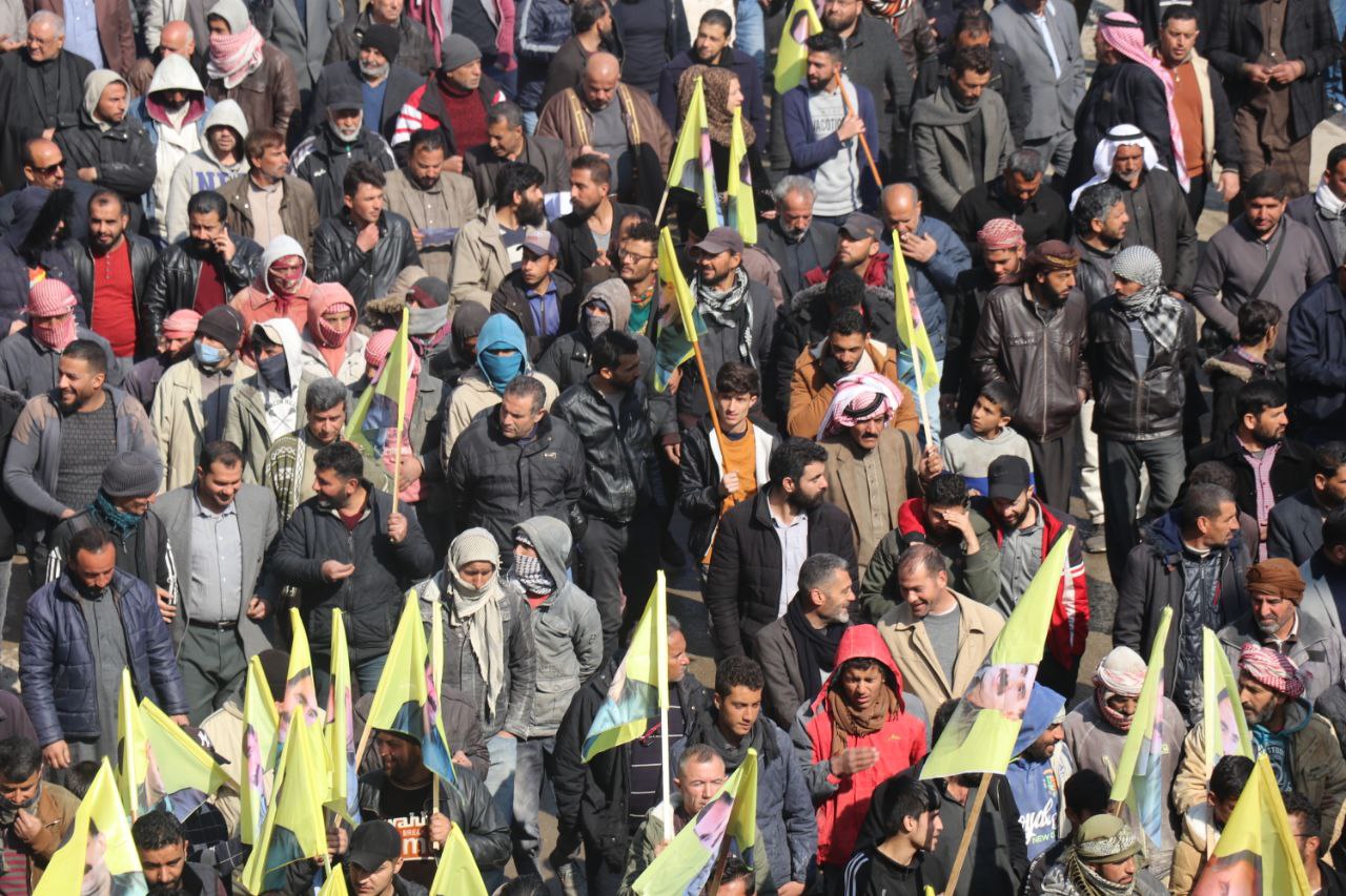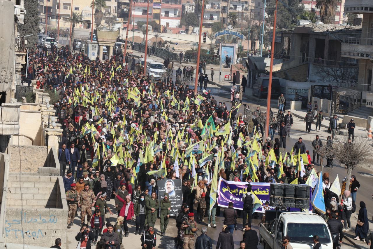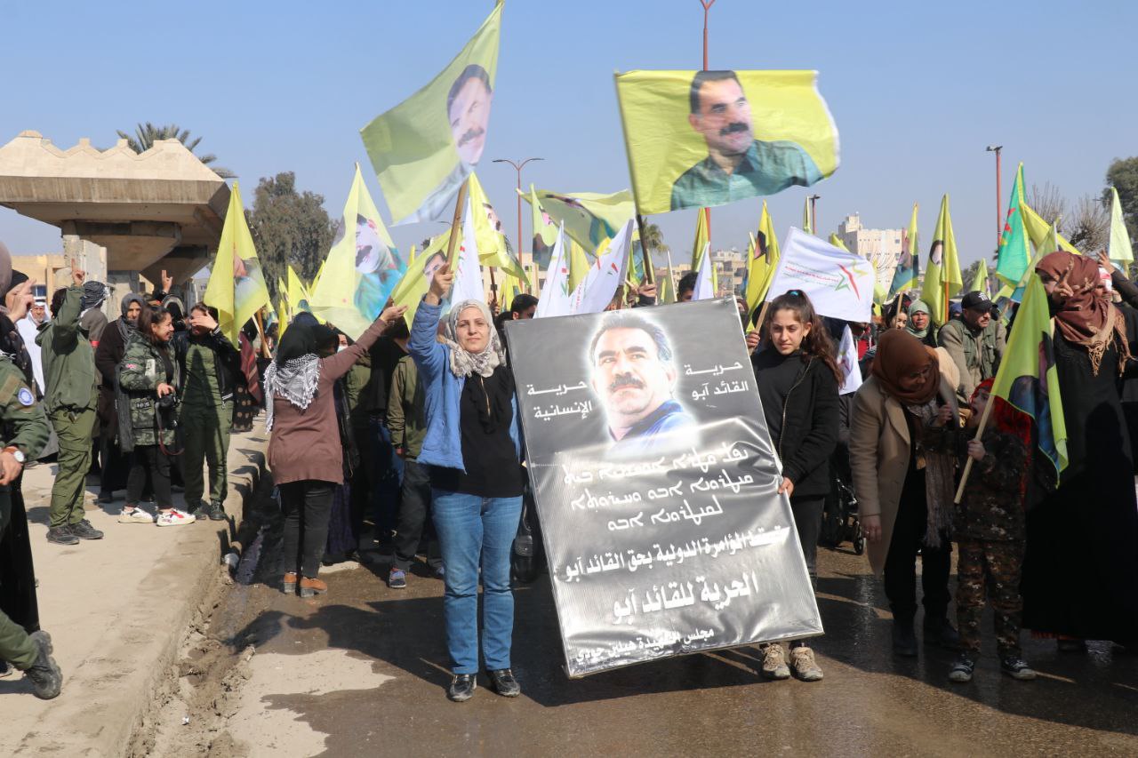 Xwepêşandan ji pêşiya qada Meclisa Giştî dest pê kir û li qada Îtfaiye (Agirkujiyê) rawestiya û veguherî mitingê. Di çalakiyê de xwepêşandêran, wêneyên Rêber Apo, alên Hêzên Sûriya Demokratîk (QSD), Partiya Sûriya Pêşerojê hildan, sloganên “Bê Serok jiyan nabe”, “Bibinkeve Komploya Navneteweyî”, “Azadî ji bo Serok Apo” berz kirin.