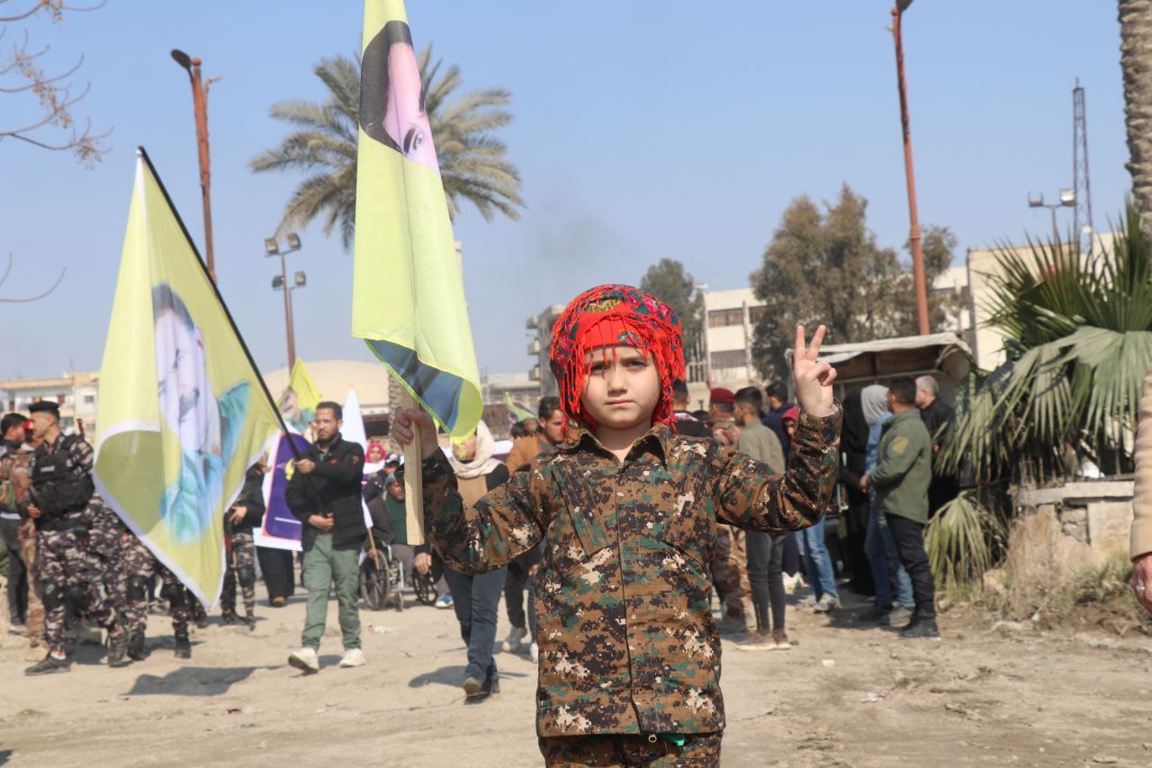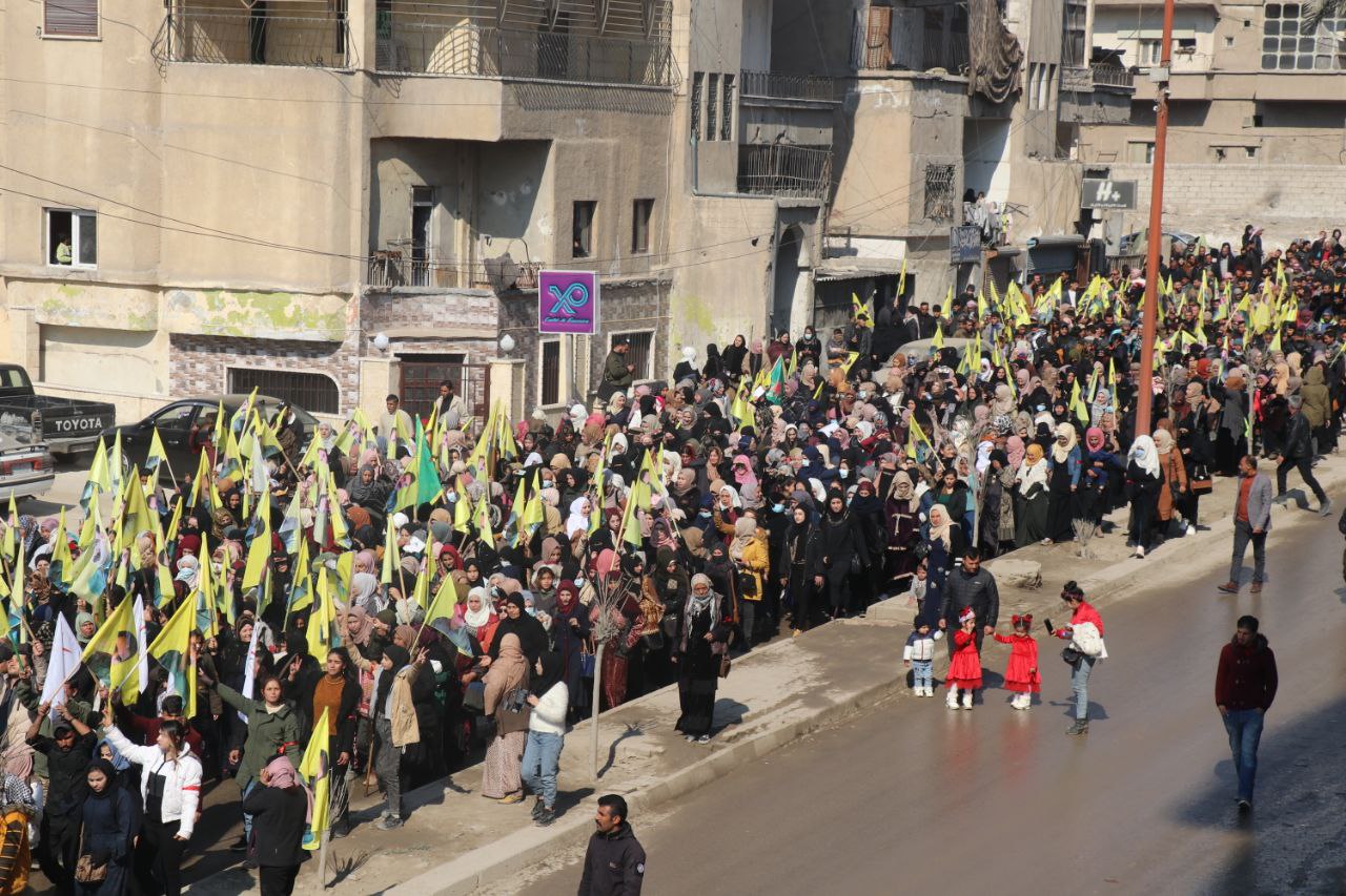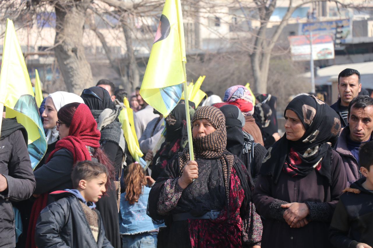 Xwepêşandan ji pêşiya qada Meclisa Giştî dest pê kir û li qada Îtfaiye (Agirkujiyê) rawestiya û veguherî mitingê. Di çalakiyê de xwepêşandêran, wêneyên Rêber Apo, alên Hêzên Sûriya Demokratîk (QSD), Partiya Sûriya Pêşerojê hildan, sloganên “Bê Serok jiyan nabe”, “Bibinkeve Komploya Navneteweyî”, “Azadî ji bo Serok Apo” berz kirin.