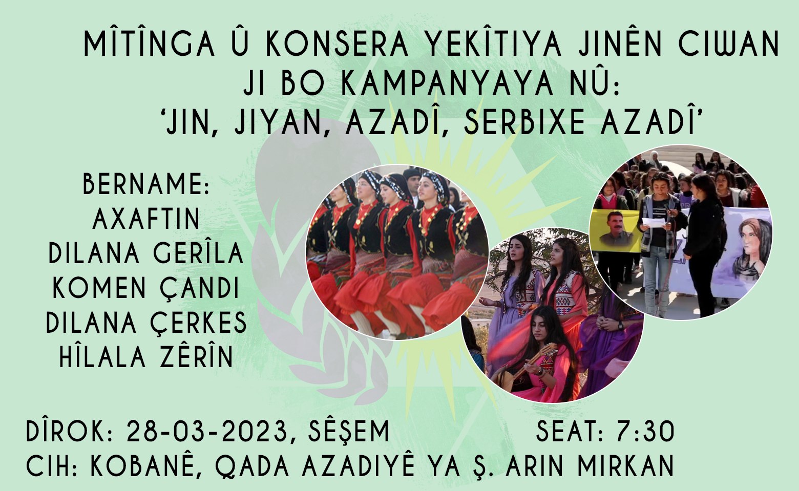 KOBANÊ – Sibe li bajarê Kobanê Yekîtiya Jinên Ciwan mîtînga û konsera xwe ya ji bo kampanyaya nû ‘Jin, Jiyan, Azadî, Serbixe Azadî’ li dar dixe.
