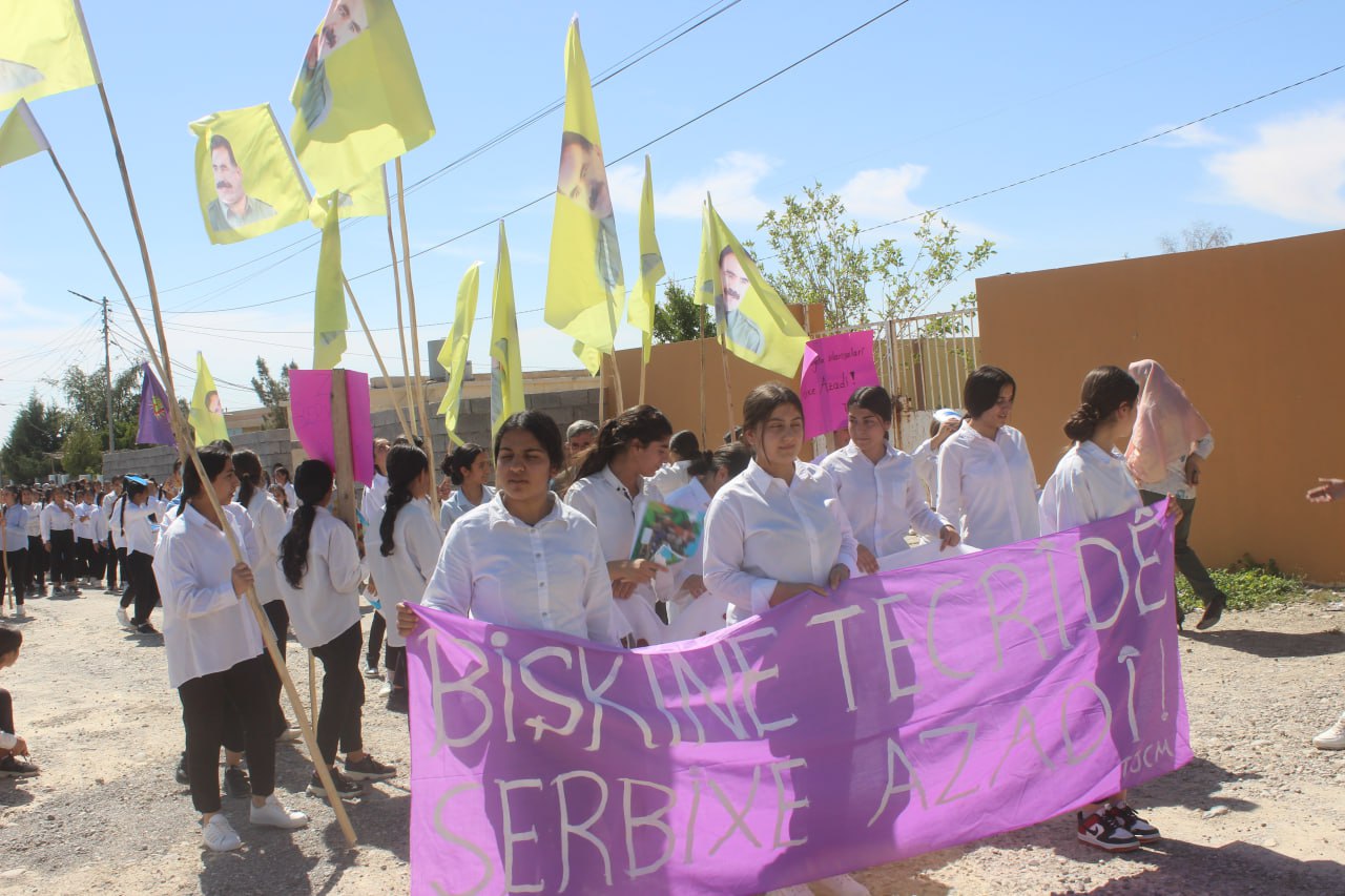 MEXMÛR – Li wargeha şehîd Rûstem Cûdî li bajarê Mexmûrê îro jinên ciwan ên xwendevan ji bo azadiya fizîkî ya Rêber APO bi silogana “Jin jiyan Azadi Serbixe Azadî” meşek lidarxistin. Îro di demjimêr 14:00 an de jinên ciwan ên xwendevanên li pêş dibistana şehid Koçerîn dest bi meşê kirin û heta pêş avahiya saziya malbatên şehidan meşiyan.
