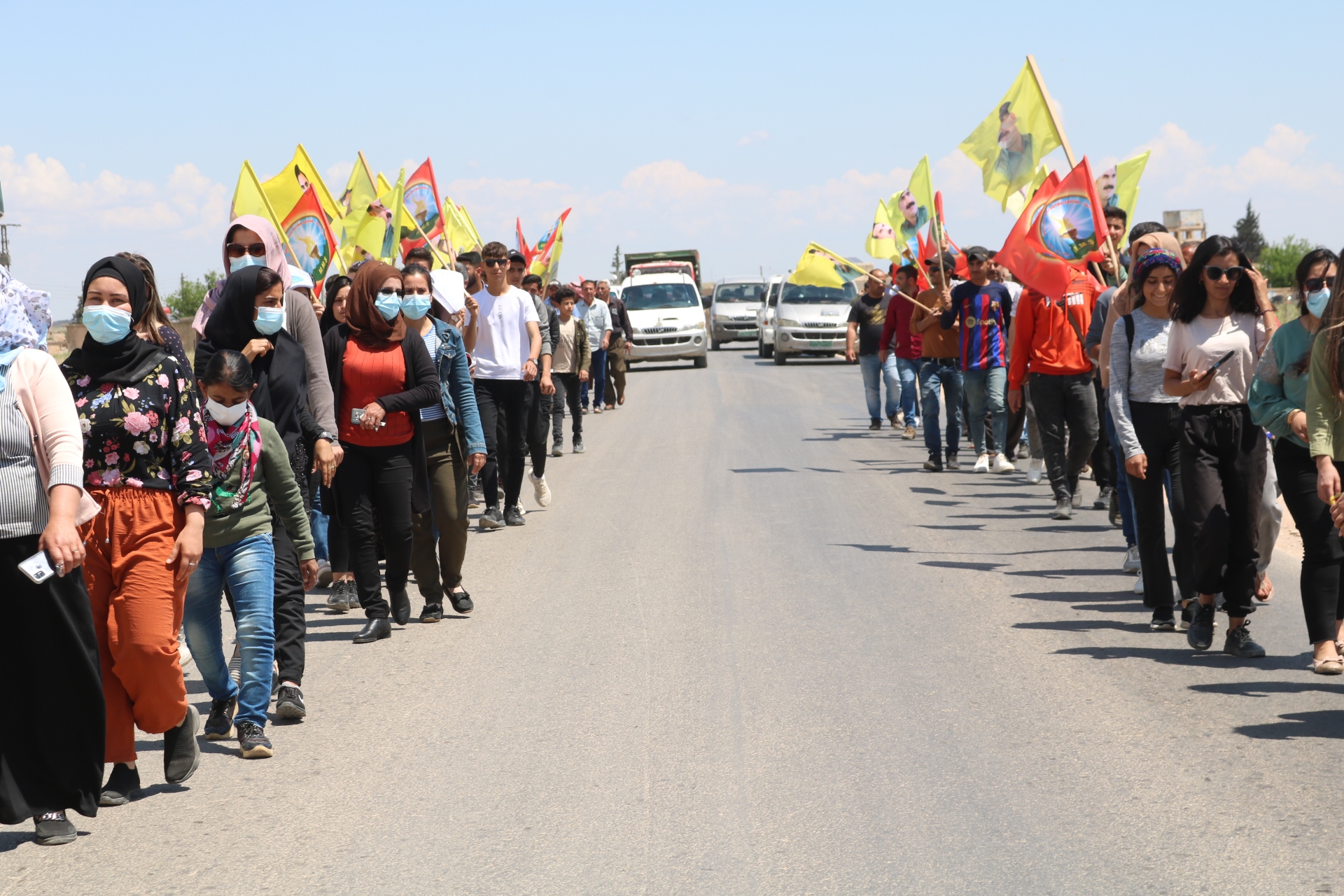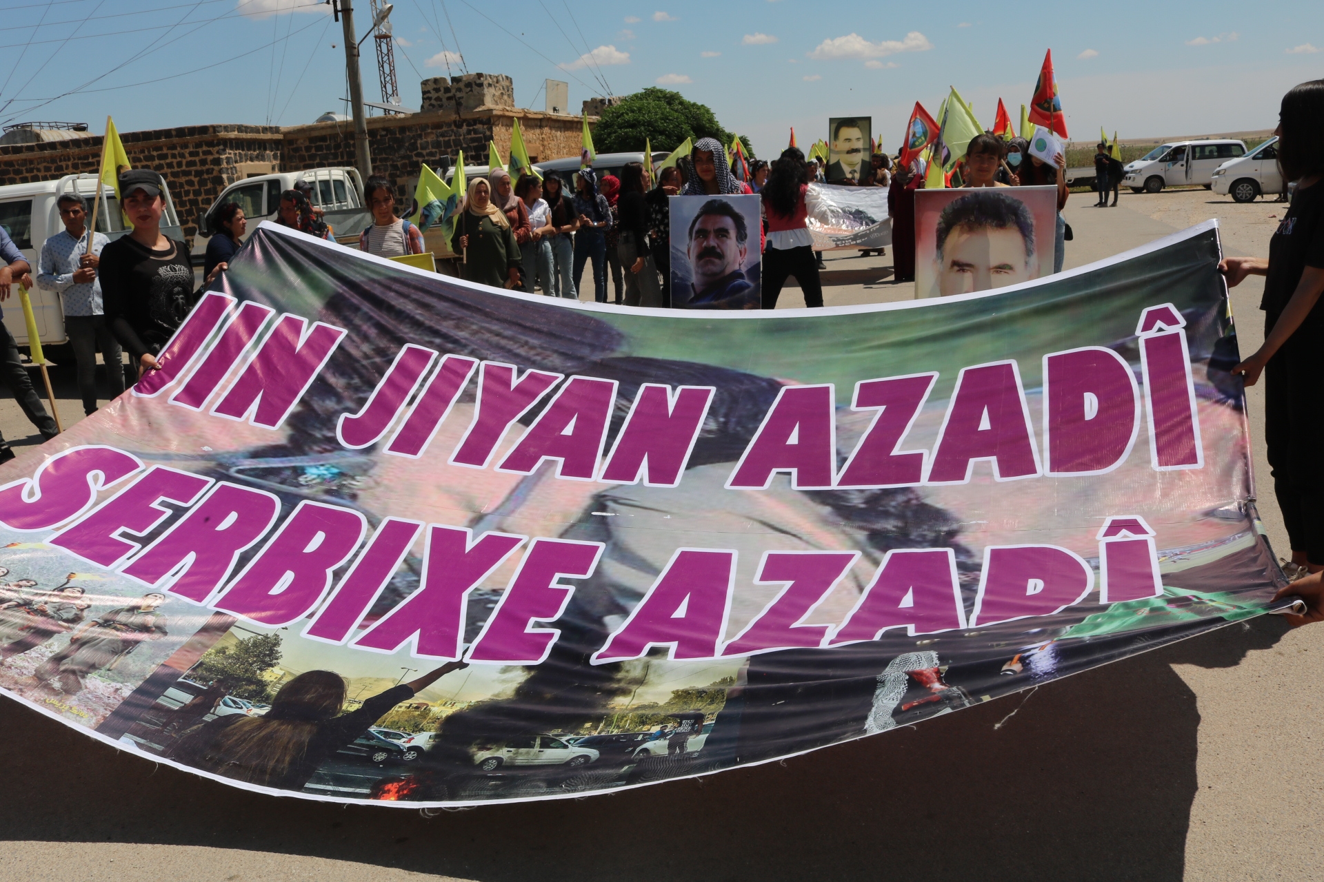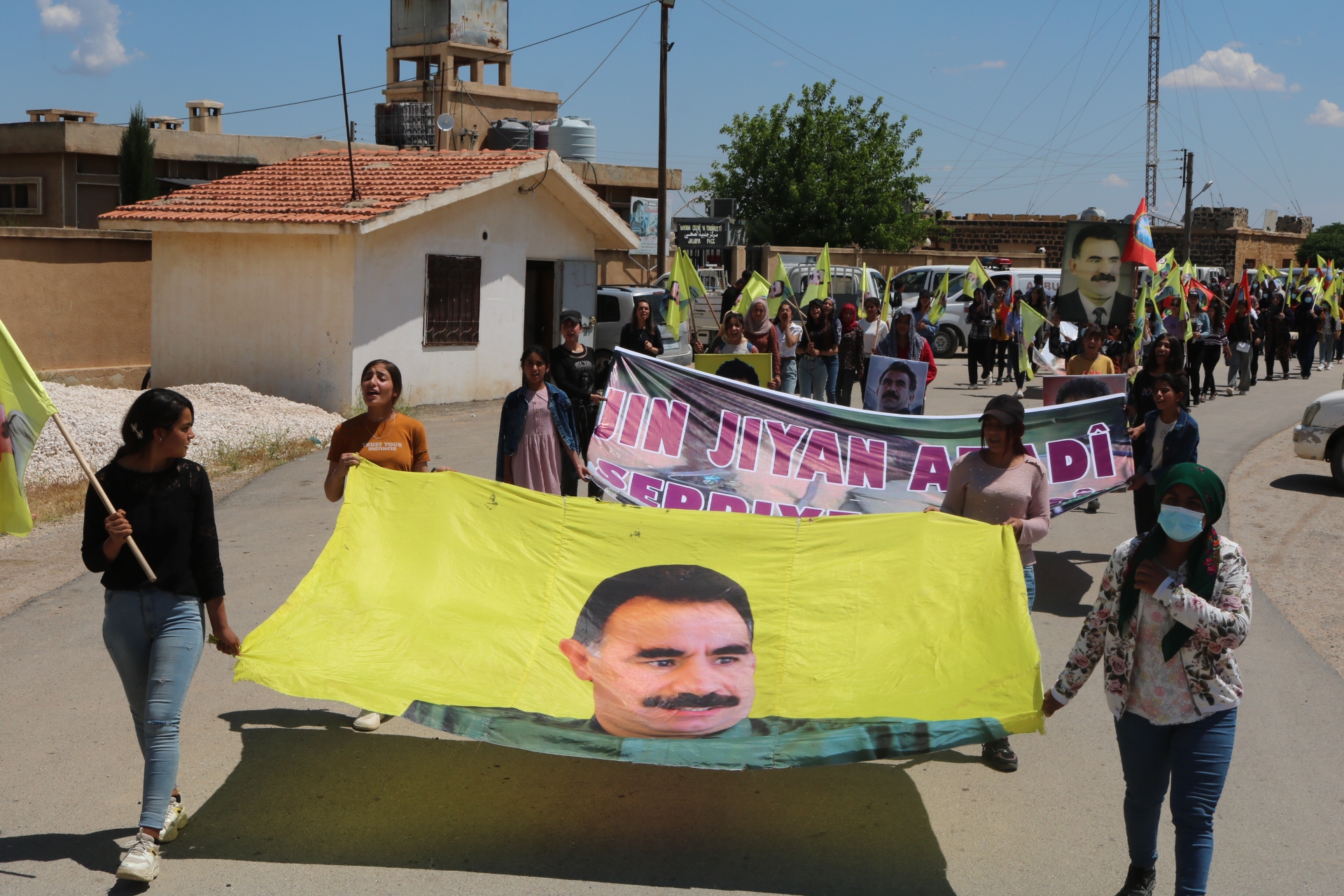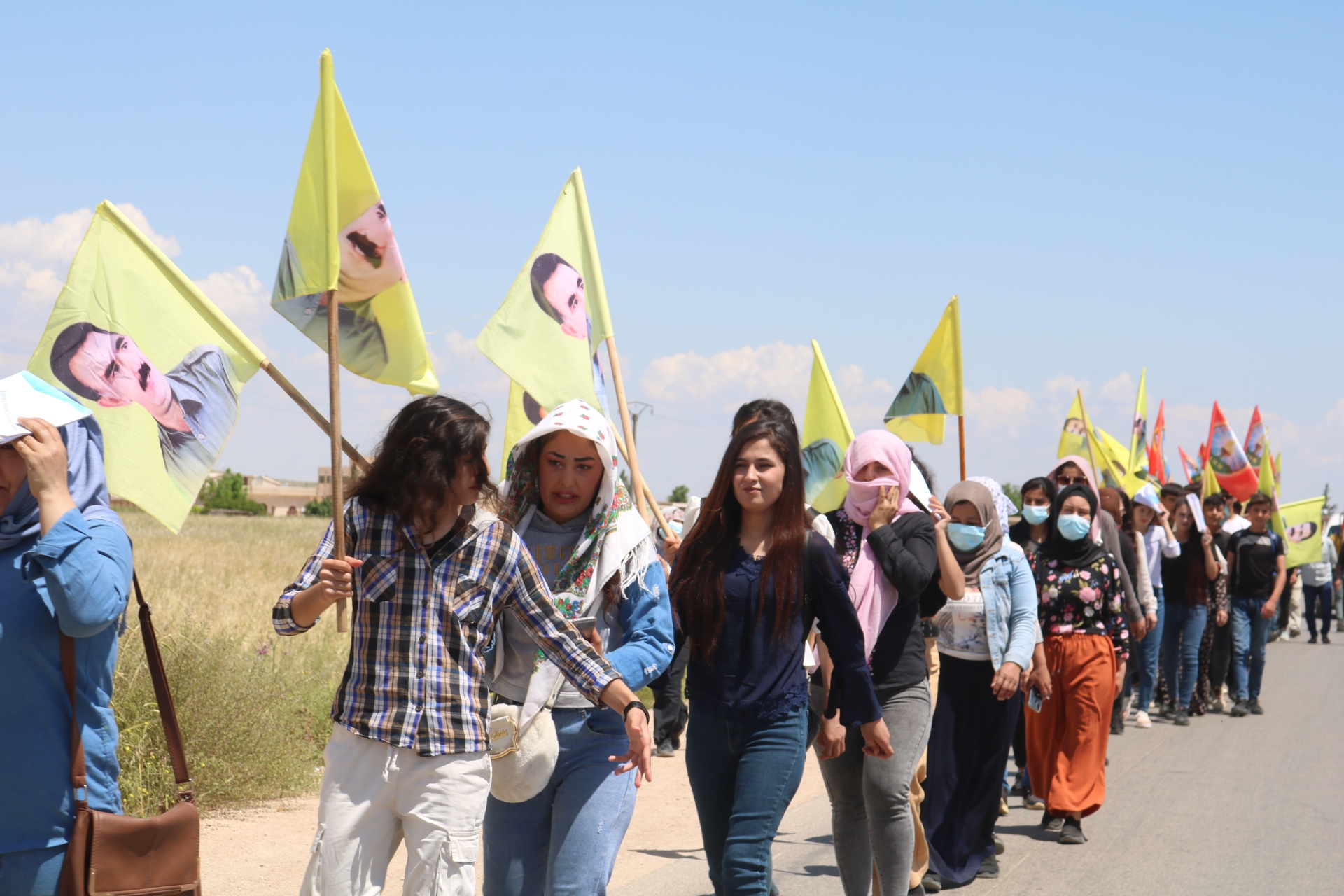 KOBANE – Yekîtiya jinên ciwan bi diruşmeya “Jin Jiyan Azadî Serbixe Azadî” çalakî lidar xist. Xwişk û zarokên şeḥîda bi pêşengtiya jinên ciwan Îro li Bajarê Kobanê li navçeya Çelebiyê. ji bo azadiya fizîkî ya RÊBER APO çalakî lidar xistin. bi dehan jinên ciwan beşdarî çalakiyê bûn. di meşê de diruşmeyê bê serok jiyan nabe hat berz kirin. di dawiyê de daxuyanî hat xwendin. bi sloganan çalakî dawî bû.