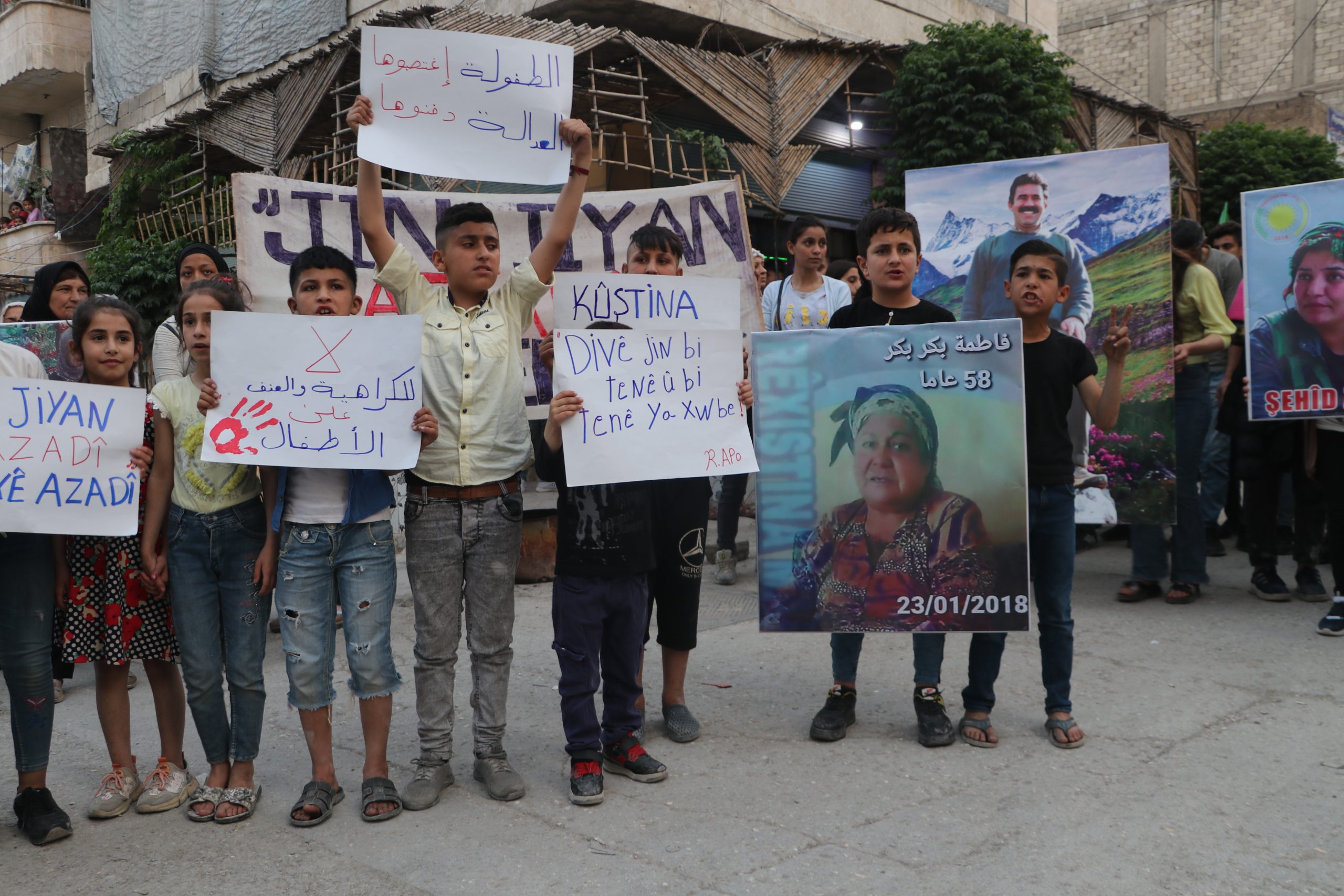 HELEB – Di nava hefteyekê de du bûyer a tecawîzkirina du zarokan yek 14 e salî û yek 10 salî li Efrînë ji aliyê çeteyên girêdayî dewleta Turk a dagirker ev bûyera qirêj pêk hat. Ji bo şermezarkirina va bûyera bi êş îro li taxa Şêxmeqsûd a bajarê Helebê ji aliyê Kongra Star û Yekîtiya Jinên Ciwan meşek hat li darxistin.Meş ji pêşiya Eywana Yasîn a ku dikeve milî xerbîya taxê û ber bi milê şerqî taxê herikîn. Di meşê de pankertên bi nivîsa”Ji bo destdirêjî yê Na Na,” Tecawîzkirina zarokan pêwîste were cezakirin,”Dengê rastiyê bê deng namîne em cezayê dixwazin,” Jin jiyane jiyanê nekûjin, hatin rakirin.