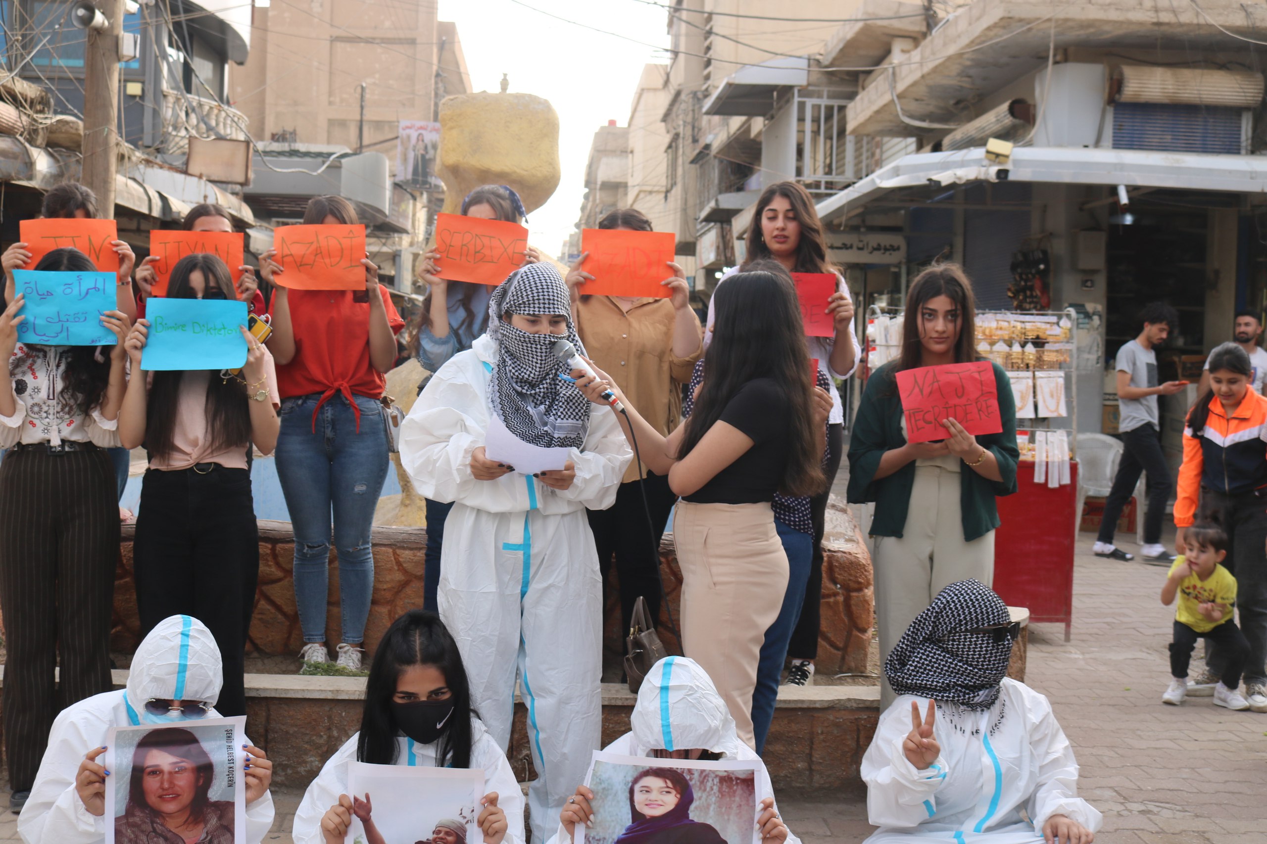 QAMIŞLO – Di bin dirûşmeya hemleya nû ‘Jin Jiyan Azadî Serbixe Azadî’ jinên ciwan ên xwendekar li navenda bajarê Qamişlo li hev civiyan û li dijî êrîşên rojane yên dewleta Tirk çalakiyek lidar xistin. Beriya her tiştî êrîşên kîmyewî yên dijmin bi tundî hatin şermezarkirin û ev yek bi cilên taybet hate nîşankirin.