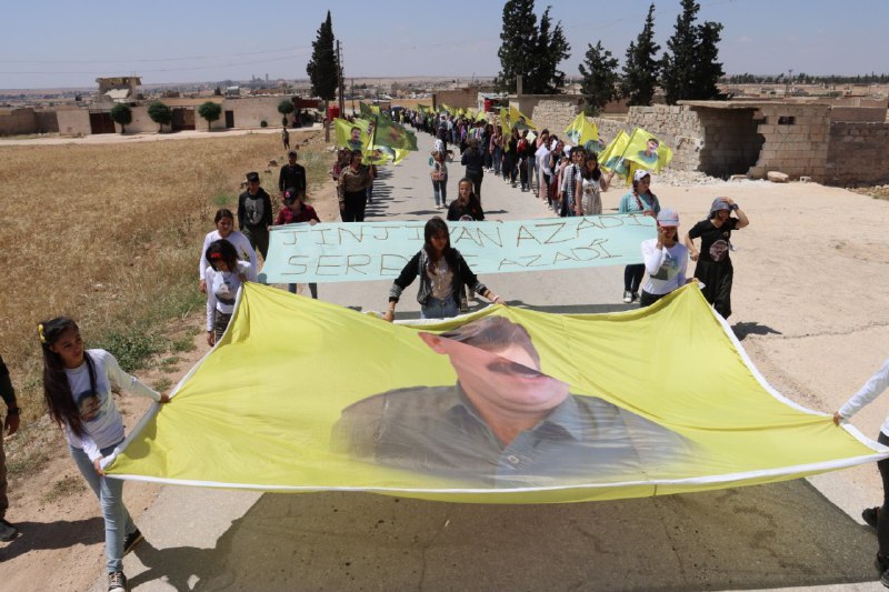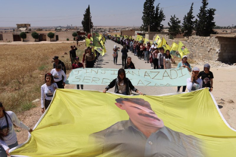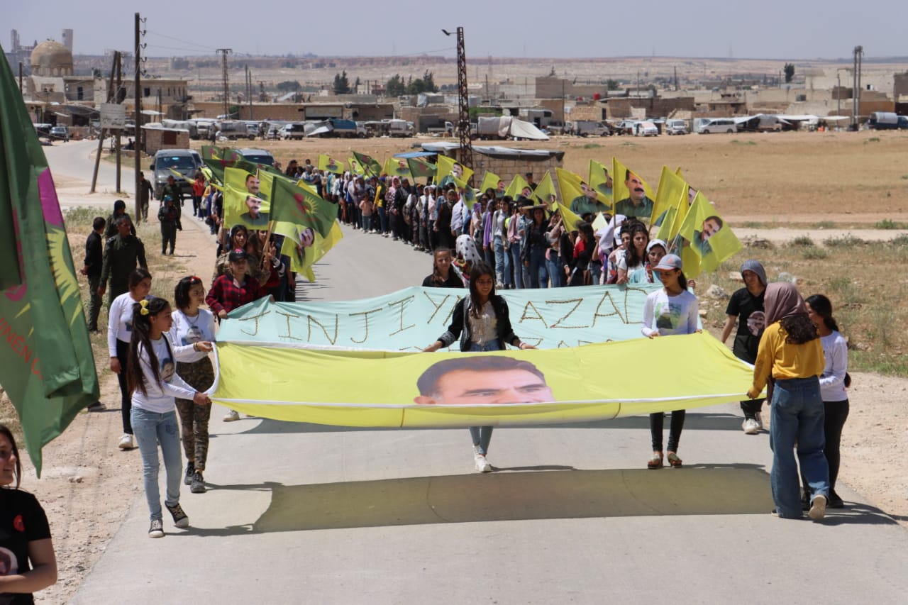 ŞEHBA – Îro Yekitiya Jinên Ciwan li Şehbayê ji bo şermezarkirina tecrîda li ser Rêber Apo meşek girseyî li dar xist. Xwepêşandan di bin diruşmeya kampanya “Jin Jiyan Azadî Serbixe Azadî” hat organize kirin. Meşa jinên ciwan bi deqeyek rêzgirtinê dest pê kir. Pankarta bi nivîsê “Jin Jiyan Azadî Serbixe Azadî” hate hildan.” Her wiha alek mezin ya Rêber Apo hat hildan. Di xwepêşandanê de dirûşmeyên “Bijî Serok Apo”, “Jin Jiyan Azadî” hatin berzkirin. Jinên Ciwan li Şehbayê dan xuyakirin ku ji bo şermezarkirina tecrîda li dijî Rêber Apo ew ê her tim di nav tevgerê bin.