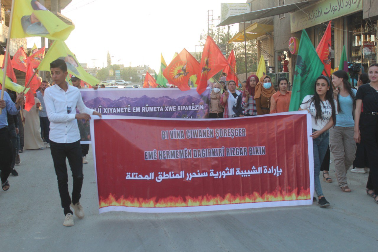 Meş bi dehan Ciwan û Jînên Ciwan û Şênîyên Hesekê beşdar bûn. Di meşê de Alê Rêber Apo, alê Tevgera Ciwanên Şoreşger û Alê Yekîtîya Jinên Ciwan û pankartên ku li ser hatibû nîvîsandin ‘’ Bi vîna Ciwanên Şoreşger emê Heremên Dagirkirî Rizgar bikin. ‘’ û ‘’ Li dijî îxanetê em Rûmetê xwe biparêzin ‘’ hatibû hildan. Di meşê de Sloganê ‘’ Bijî Berxwedana Rojava ‘’ ‘’ Faşist Erdoğan ‘’ û ‘’ Bimre îxanet ‘’ hatin Bangkirin.