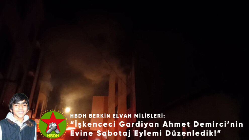 NAVENDA NUÇEYAN – Di daxuyaniya HBDH’ê de hate ragihandin ku Ahmet Demîrcî yê li Girtîgeha Tîpa T a Şakranê gardiyaniyê dike, bi tundî nêzî girtiyan û xelkê li derdorê bûye, heqaret kiriye û hate gotin, “Di 13’ê Hezîranê de milîsên me yên li Îzmîrê di şexsê vî faşîst de ji bo hişyariyê bidin zebaniyên zindanan ên êşkencekar, çalakiya sabotajê kirin û mala Demîrcî şewitandin. Milîsên me çalakî diyarî Huseyîn Arasan kirin û bi rengekî serketî ji qadê çûn.”