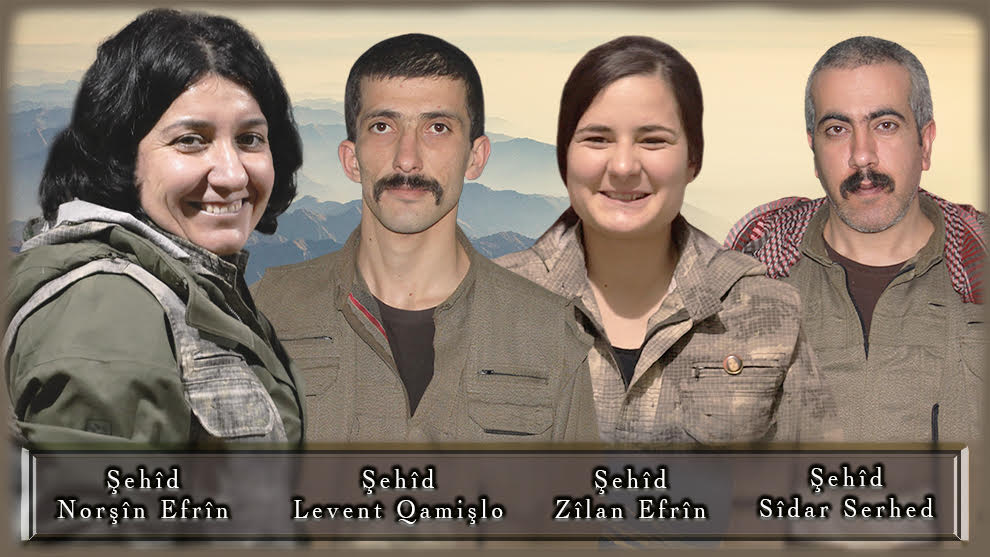 “Di êrîşa dijmin de ya ku di 8’ê Tebaxa 2022’an de li herêma Garê pêk anî, hevrêya me Norşîn Efrîn kuı endama Fermandariya Eyaleta Garê bû û hevrêyên me Zîlan Efrîn, Sîdar Serhed û Levent Qamişlo şehîd bûn.
