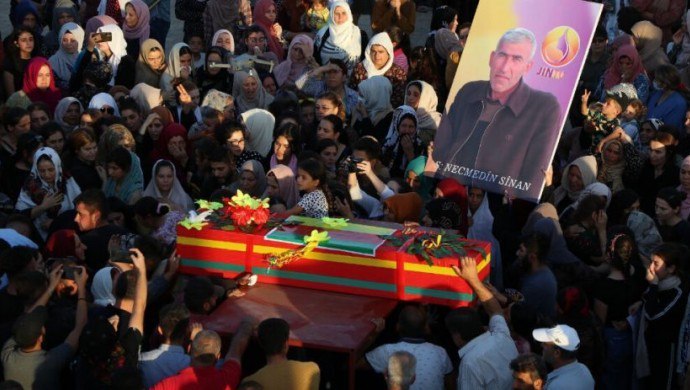 AMÛDE – Bi sedan şêniyên navçeya Amûdê û gundên wê ji bo veşartina cenazeyê karmendê Jin TV, Necmedîn Feysel Hec Sînan, li hev civiyan. Karwanê cenazeyê şehîd ji pêşiya çerxerêya rêya Dirbêsiyê ber bi goristana Şehîd Îsmaîl ve kete rê. Li goristanê, endamê Meclisa Malbatên Şehîdan Mistefa Amirî axivî û got: “Destkeftiyên gel, bi saya şehîdan hatin bidestxistin. Em ê têkoşîna şehîd Necmedîn temam bikin û destkeftiyên şehîdan biparêzin.”