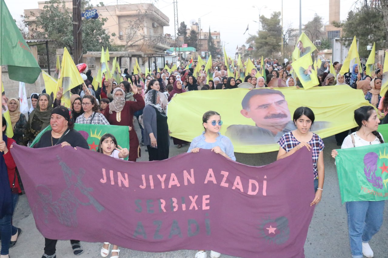 QAMIŞLO – Yekîtiya Jinên ciwan li Qamişlo li dijî tecrîd li ser Rêber APO meşîyan. Bi sedan jinên ciwan û gelê Qamişlo pejdarî meşê bûn. Meş li diwara Sunî despêkir û heye Medînê Şebab dewam kir. Meş bi sloganan ”Bê Serok Jiyan nabe” û ”Jin Jiyan Azadî” di nava sûka Qamişlo de derbasbû. Li pêşîya Medînê Şebab daxuyanî hat xwendin.