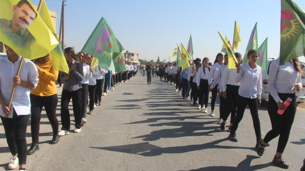KOBANÊ – Li navçeya Qinê ya Herêma Firatê bi sedan jinên ciwan li dijî Komploya li ser Rêber APO bi dirûşmeya “Bi vîna jinên ciwan em ê azadiya Rêbertî misoger bikin” meşek lidar xist. Meşa ciwanên ku bi yek dengî azadiya fîzîkî ya Rêber APO xwestin, ji Meclîsa Navçeya Qinê destpê kir û heta Mefreqa gundê Qordîne dewam kir. Di meşa ku wêneyên Rêber APO û alên tevgera jinên ciwan hatin hildan de bê navber dirûşmeyên “Bê Serok Jiyan Nabe” hatin berzkirin.