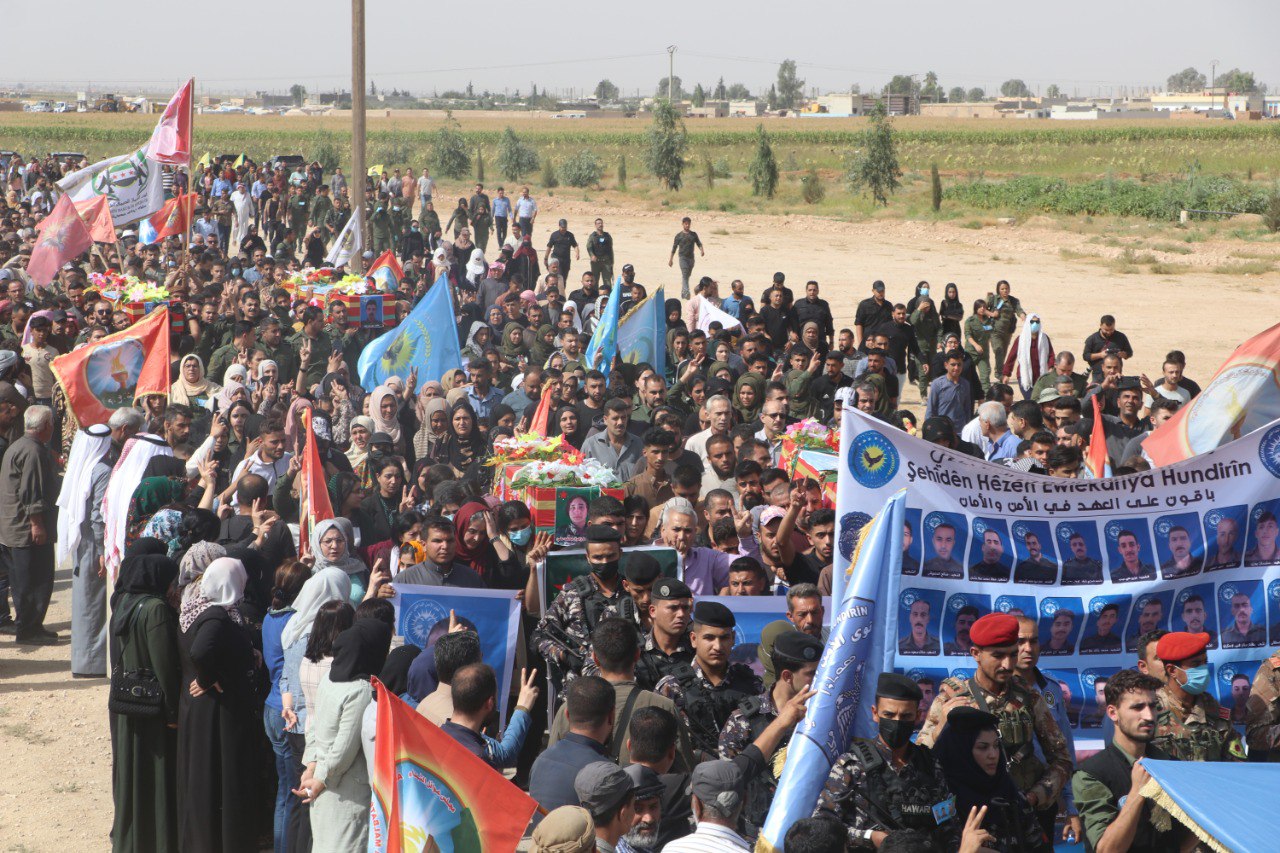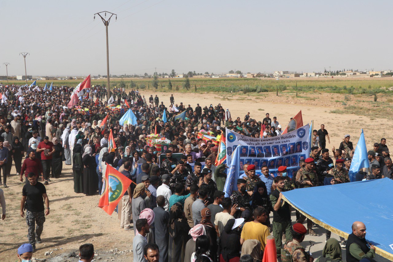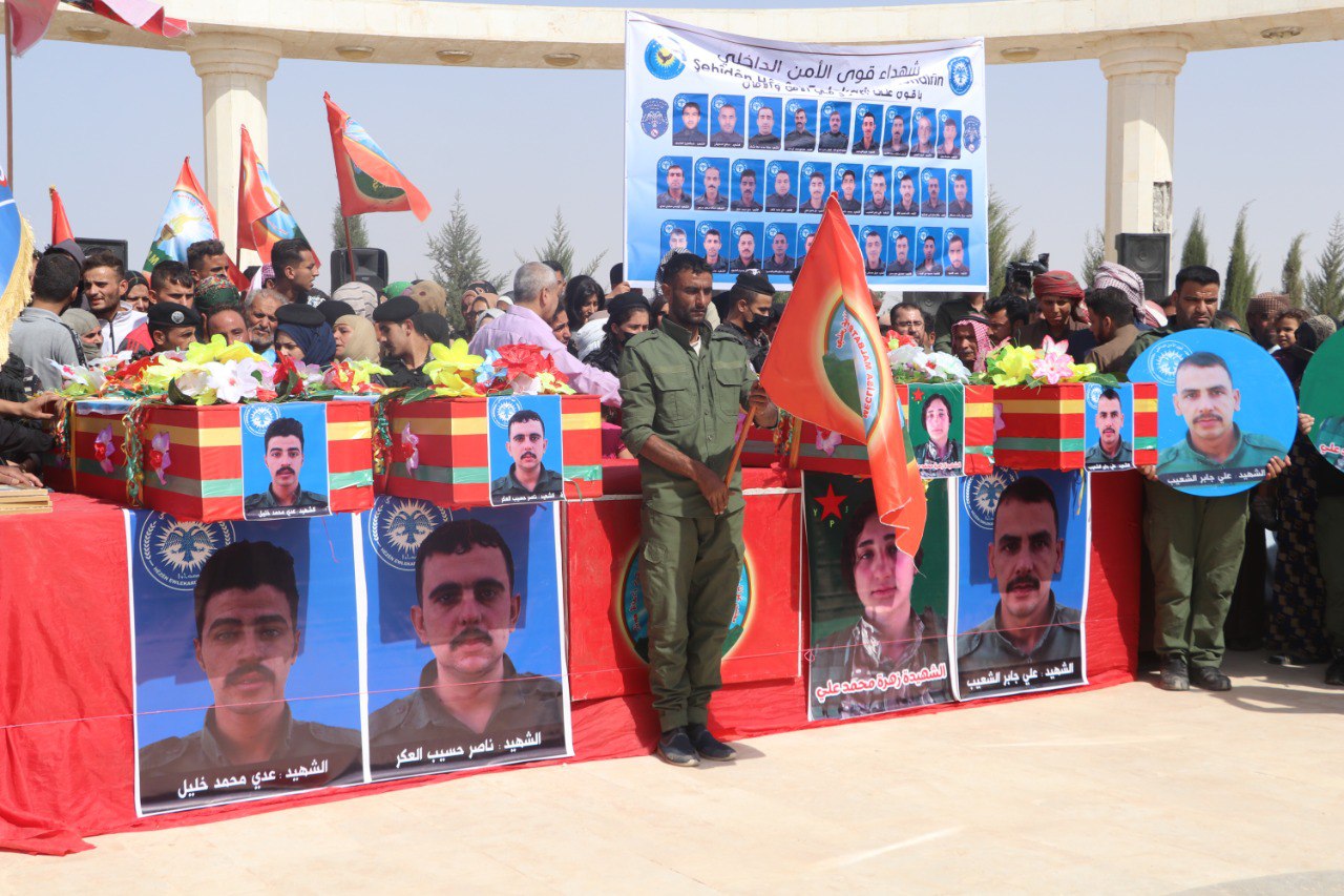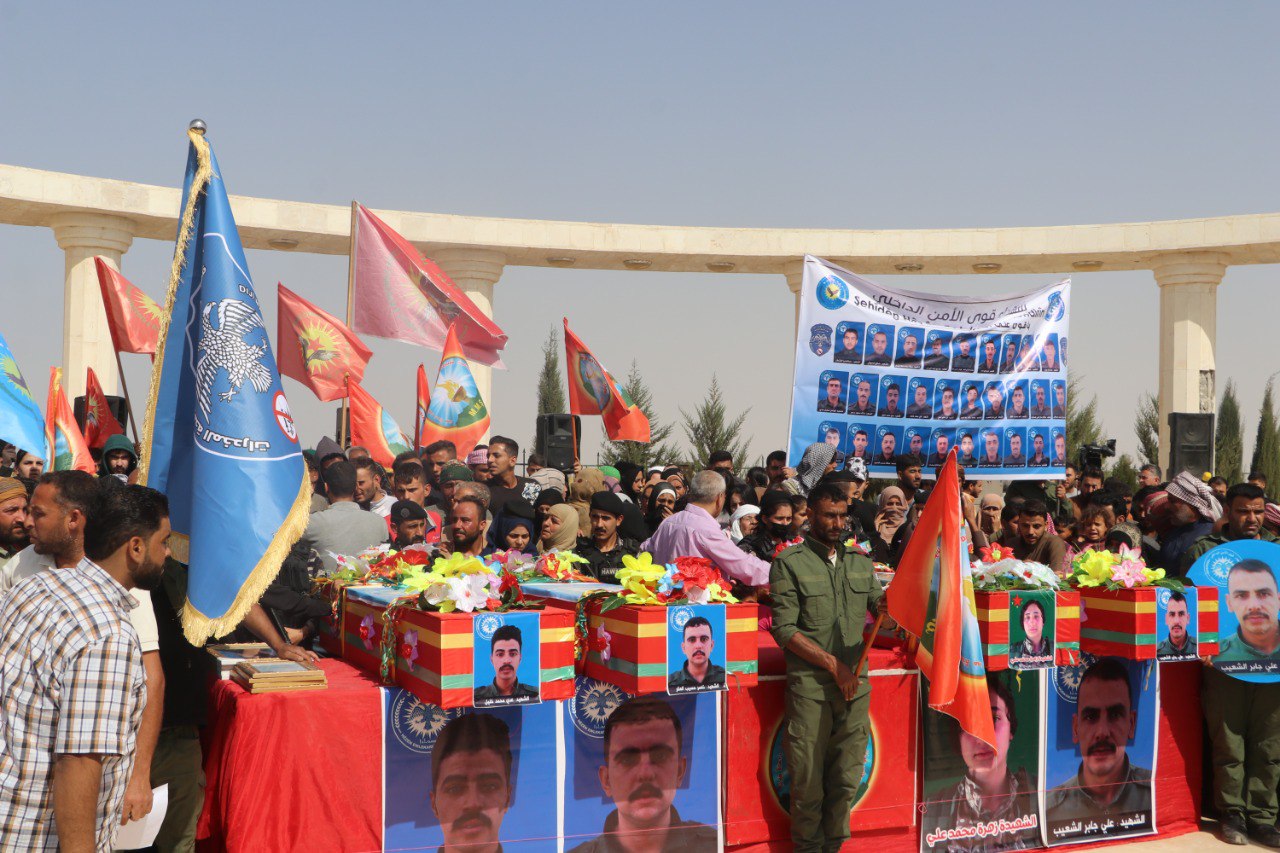 REQA – Cenazeyên Elî Cabir El Şueyb, Nasir Hesîb El Eker û Ûdey Mihemed Xelîl ên ku 8′ê Cotmehê di êrişa dewleta Tirk a dagirker a li dijî Akademiya Têkoşîna Li Dijî Madeyên Hişbir de şehîd bûbûn, her wiha cenazeyê şervana YPJ′ê Zehra Mihemed Elî bi merasîmekê li Goristana Şehîdan a li gundê Hikûmiyê yê bakurê Reqayê hatin veşartin. Bi hezaran şêniyên Reqa, Dêrazor û Tebqayê jî di nav de, endamên saziyên sivîl, hêzên leşkerî, Hêzên Ewlekariya Hundirîn, Rêveberiya Xweser a Bakur û Rojhilatê Sûriyeyê, endamên Meclisa Sivîl a Reqayê, partiyên siyasî, rêxistinên jinan, komîn, meclis, şêx û rûspiyên eşîran beşdarî merasîmê bûn.
