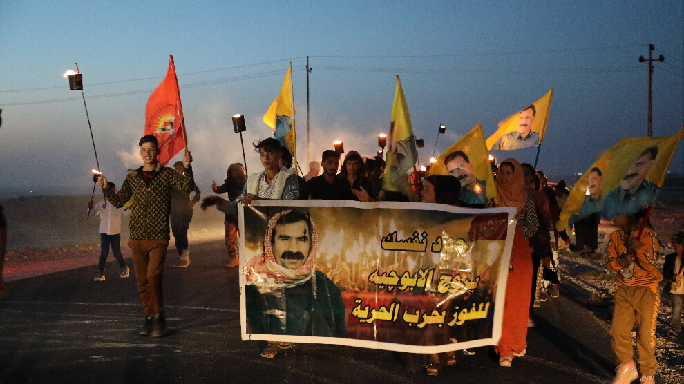 ŞENGAL – Di çarçoveya pêngava ku bi dirûşmeya “Ji Rêber Apo re azadî ji Şengalê re xweserî’ hatibû destpêkirin de, li Şengalê çalakî didomin. Duh êvarê ciwan û jinên ciwan ên Ereb ên Şengalê ji bo azadiya fizîkî ya Rêber APO meşeke bi meşeleyan li dar xistin. Meşê bi dirûşm û rakirina wêneyên Rêber APO ji gundê Xelef heta seytera gundê Barê berdewam kir. Piştî meşê daxuyanî ji aliyê endamê meclisa ciwanên Ereb Miseb Elereb ve hat xwendin û wiha hat gotin: