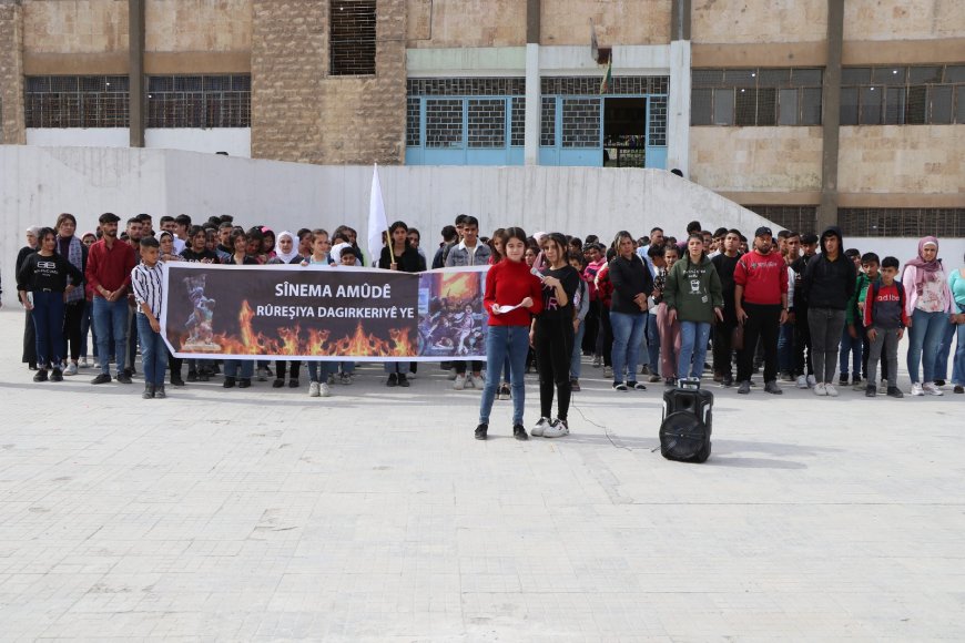 HELEB – Sibê (13 Mijdar) salvegera 63`an a Şewata Sînemaya Amûdê ye ku di encamê de 283 zarokên ji navçeya Amûdê ya girêdayî kantona Qamişlo bûn qurbanî. Xwendekar, endamên Komîteya Perwerdeyê û Perwerdeya Civaka Demokratîk ên taxên Şêxmeqsûd û Eşrefiyê yên Helebê ji bo bîranîna şehîdên komkujiyê li Dibistana Şehîd Cûdî Amanos a li Eşrefiyê kom bûn û daxuyaniyek da.