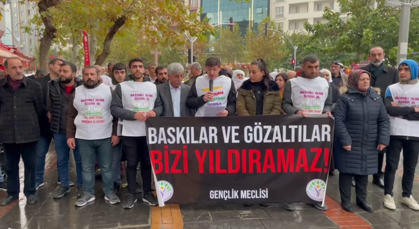 TJA, Meclîsa Dayikên Aştiyê, Endamên Meclisa Ciwanên HEDEP Êlihê, Rêxistinên DBP û HDP’ê yên Parêzgehê beşdarî daxuyaniya li ber avahiya qeymeqamtiya HEDEP’ê bûn. Di daxuyaniya ku pankarta “Zext û binçavkirin nikarin me bitirsînin” hat vekirin de Endamê Meclîsa Ciwanên HEDEP’ê Eyûb Alkan bertek nîşanî êrîşa polîsan da û got, “Berî her tiştî divê baş bê zanîn ku em nûnerên kevneşopiyeke ku. dîrok tijî berxwedan û têkoşîn e. Heger me li hemberî zext, çewisandin, binçavkirin û girtinan çokan bidana îro yek kes jî nedibû. Zêdetirî 8 sal in gelê me di bin zilm û zorê de ye.”