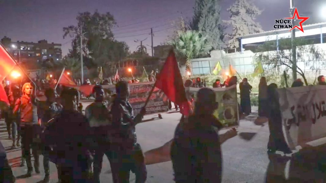 Tevgera Ciwanên Şoreşger û Yekîtiya Jinên Ciwan a Tebqayê di bin dirûşmeya “Ji Rêber Apo re azadî, ji pirsgirêka kurd re çareserî” ji pirsgirêka kurd re” bi beşdariya jin û xortên ciwan herêmê û tevgerên ciwanan danê êvarê meşeke meşaleyî li dar xist. Xwepêşandan ji taxa sêyemîn dest pê kir û pankartên bi nivîsa “Ji dagirkeriya Tirk re na”, “Na ji armanckirina saziyên jiyanî” hatin hildan. Bi dengekî bilind, redkirina dagirkeriya dewleta Tirk û siyaseta wê û daxwaza azadiya fîzîkî ya Rêber Apo. Dema gihiştin taxa duyemîn, beşdaran deqeyek rêzgirtin li ser giyanê şehîdan rawestiyan. Piştre jî daxuyaniyek hate dayîn. Berdevka Yekîtiya Jinên Ciwan “Saja Ayed” serkeftinên hêzên gerîla yên li çiyayan û têkbirina dewleta Tirk a dagirker pîroz kir.