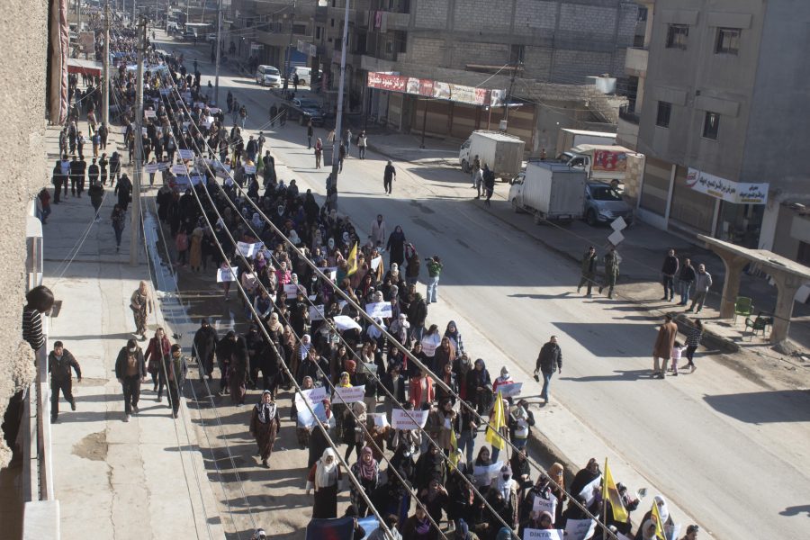 Meş bi beşdarbûna hezaran zarok, ciwan, jin û mêr li ber Dermanxaneya Deham dest pê kir. Di pêşiya meşê de pankartên bi suretên êrîşên dawî û silogana “Bijî Berxwedana Rojava” bi zimanên kurdî û erebî hatin hildan. Meş li çarxereya Tîmsal veguherî mîtîngekî.