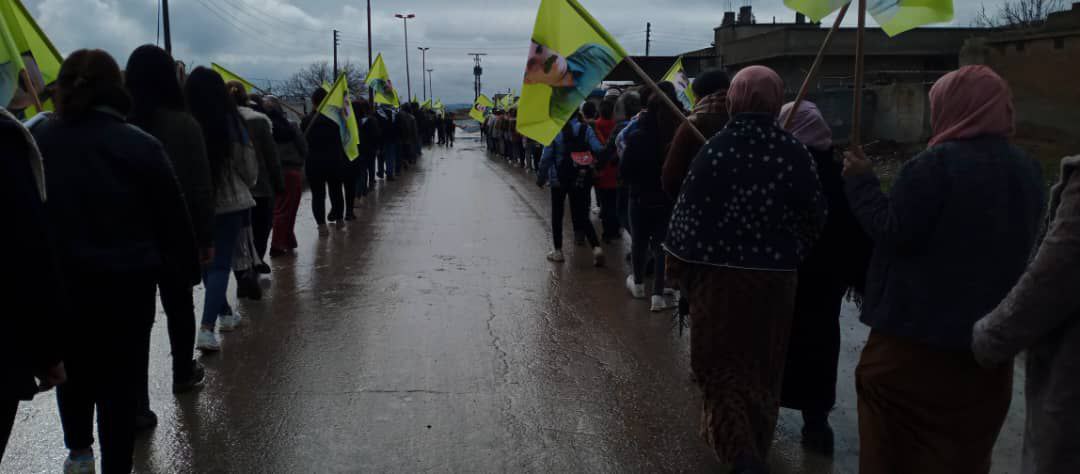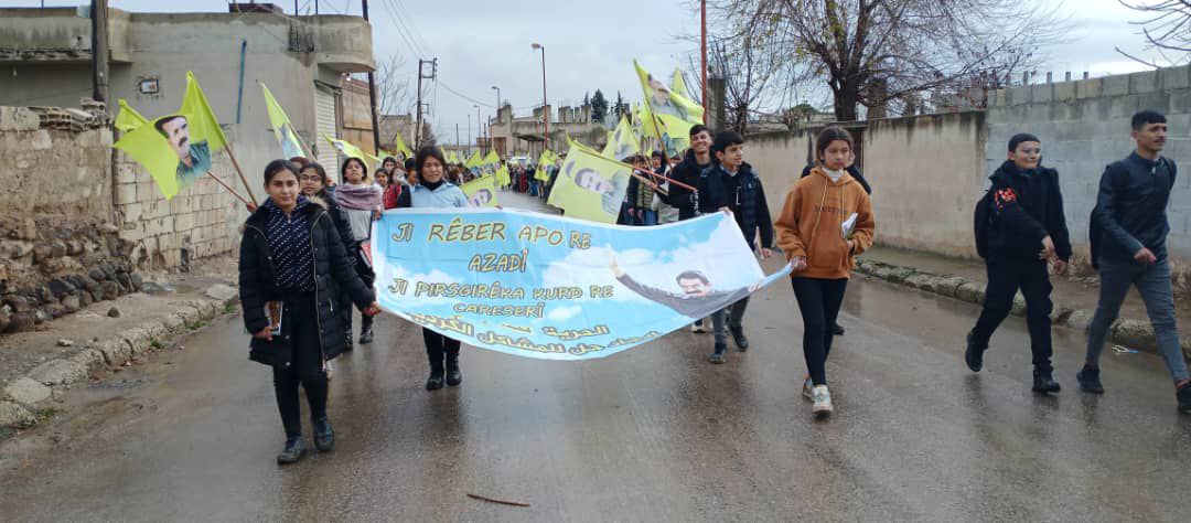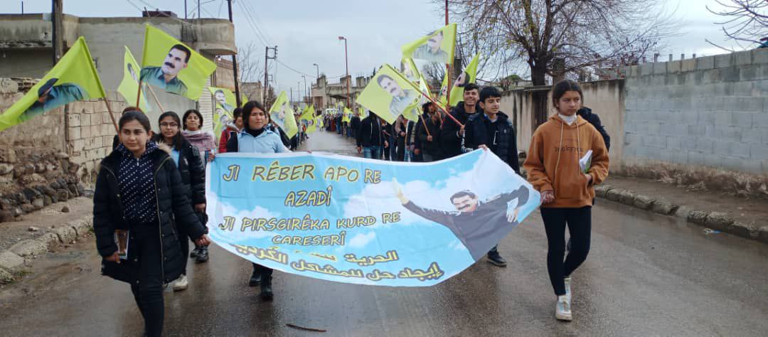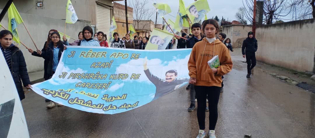 KOBANÊ – Îro saet 11’an sibê Tevgera Ciwanên Şoreşger li navçeya Şêranê girêdayî Kobanê li dijî tecrîdê li ser Rêber Apo li girava girtîgeha Îmralî û ji bo daxwaza azadiya fîzîkî ya Rêber Apo meşek li darxistin. Ev çalakî di çarçoveya hemleya navnetewî bi silogana “Ji Rêber Apo re azadî, ji pirsgirêka kurd re çareserî” de, ya ku di 10’ê Cotmehê 2023 li 74 navendên cîhanê hat dest pê kirin, hat li dar xistin.