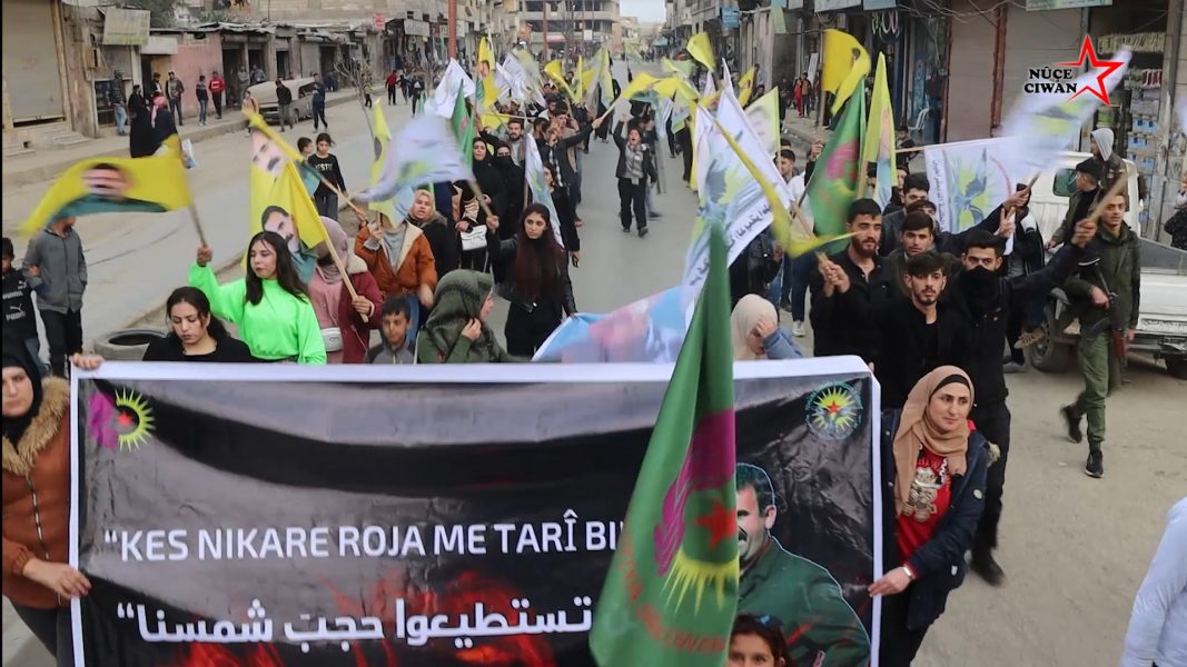REQA – Yekîtiya Jinên Ciwan û Yekîtiya Xwendekarên Demokratîk a zaningehê a bajarê Reqa ji bo şermezarkirina komployê li ser Rêber Apo meşekî li dar xistin.
