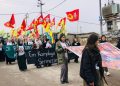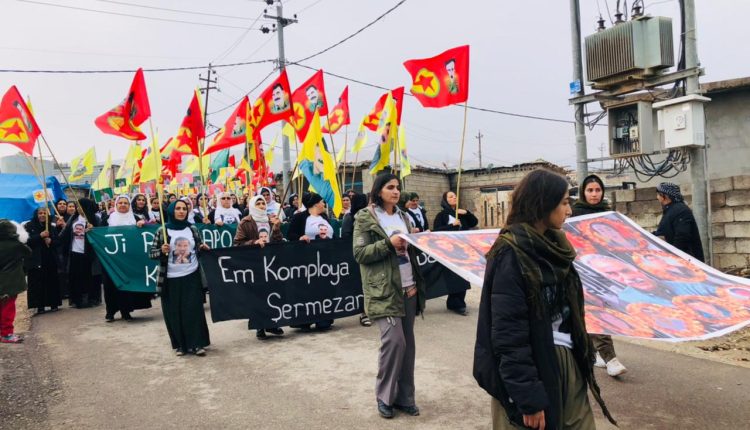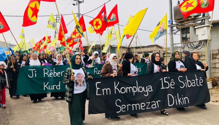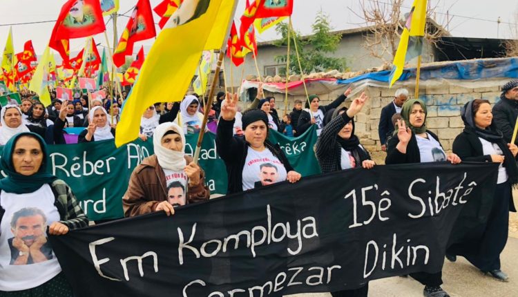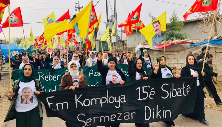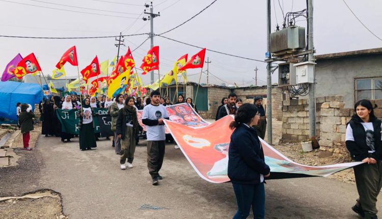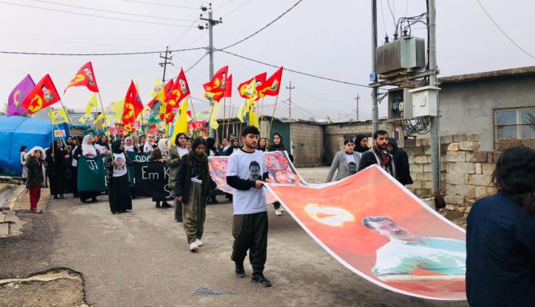 NAVENDA NÛÇEYAN- Bi boneya salvegera Komploya Navneteweyî ya li ser Rêber APO, xelkê Wargeha Penaberan a Mexmûrê ji heft salî heta heftê salî dest bi meşeke girseyî kirine û hemû bi yek dengî dirûşmeya ‘Kesek nikare roja me tarî bike’ berz dikin.
