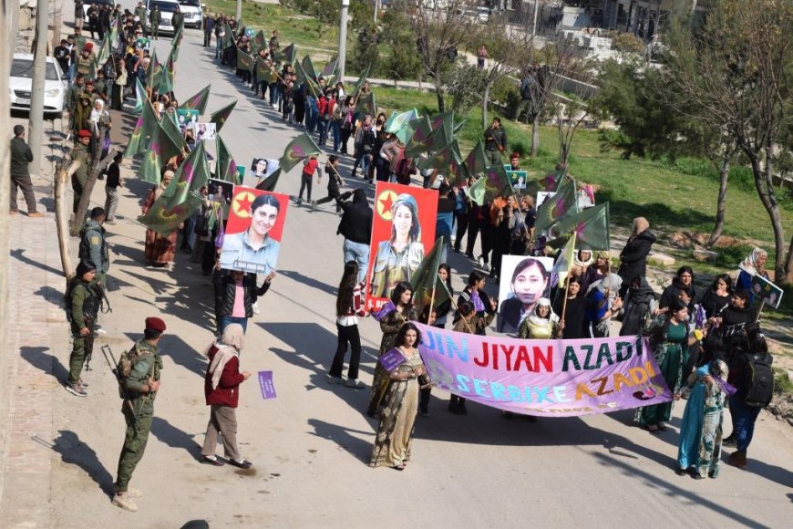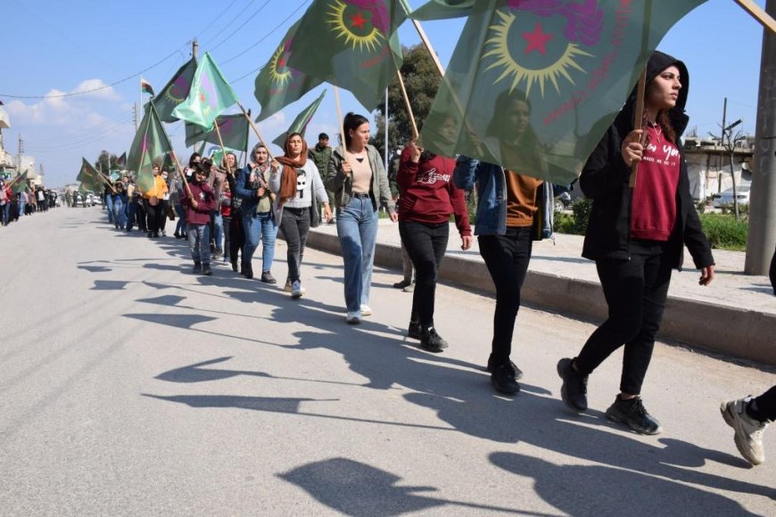 Yekitiya Jinên Ciwan bi boneya 8’ê Adarê li Kobanê meşek li dar xist.