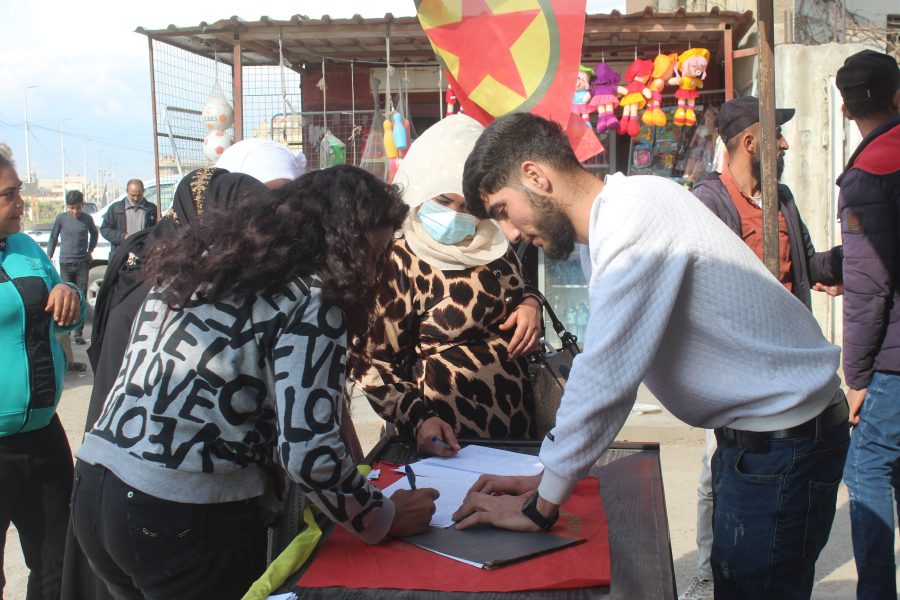 QAMIŞLO – Îro li bajarê Qamişlo Tevgera Ciwanên Şoreşger ji bo komkirina imzeyan ji bo daxwaza azadiya fîzîkî ya Rêber Apo 2 stand vekir. Stand li ber garajên bajarê bi alên Rêber Apo, Partiya Karkêrên Kurdistan (PKK) û Tevgera Ciwanên Şoreşger hatin xemilandin. Gel bi coş imzeyên xwe dan.