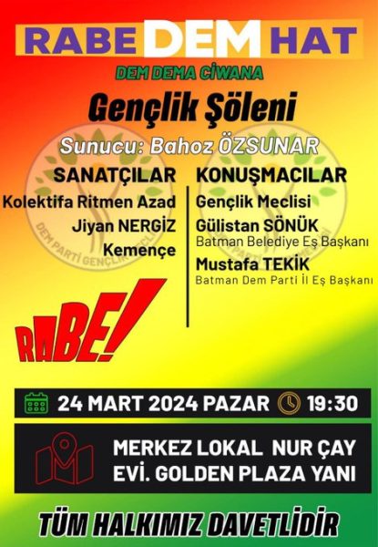 Festîvala ku wê bi dirûşma “Dema Ciwanan” bê lidarxistin, îro saet di 19.30’an de li Navenda Locala Elîhê DEM Parti bi beşdariya namzeta Hevşaredar Gulîstan Sönük û Hevserokê DEM Partî ya Elîhê Mustafa Teknîk û gelek kesan hnermendan pêk were.