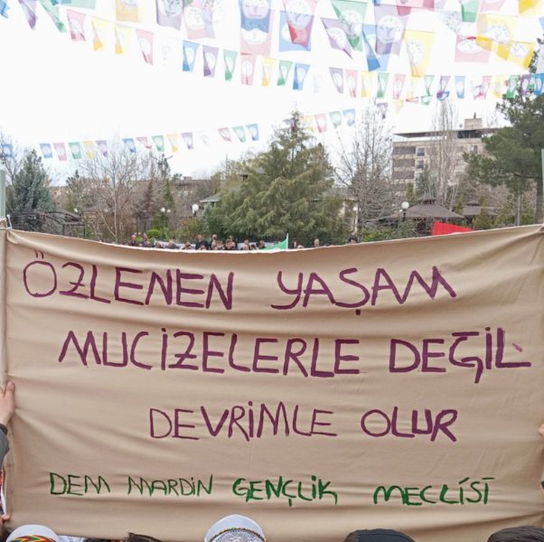 Piştî axaftina Hevseroka DEM Partiya DEM’ê ya parêzgeha Midyadê Necla Acıbuca, namzetên Hevserokatiya Şaredariya Midyadê ya DEM’ê Huda Erdem Aslan û Hikmet Duman derketin ser dikê û banga parastina sindoqan li gel kirin.