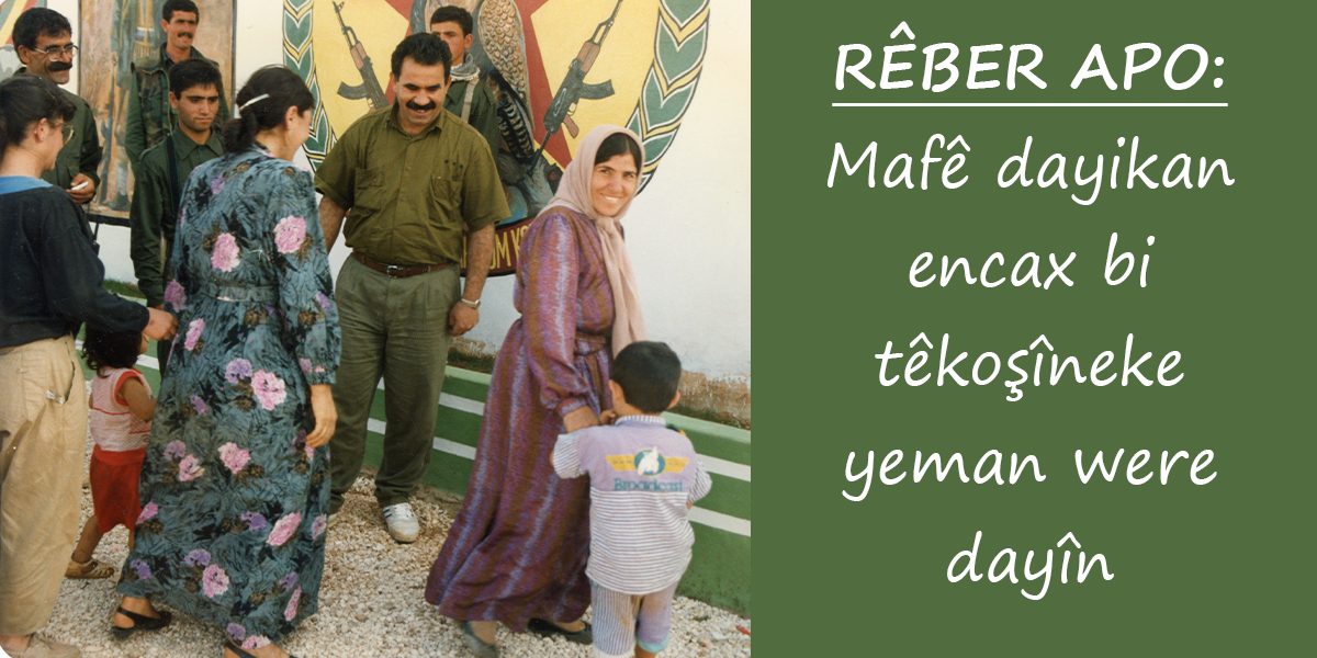 Di PKKê de em kesayet jinûve lêdihûrin. Jibo me ne rêya navîn ne jî tiştekî din lazime. Sedemên vê çine, hûn çiqas bi van bandor bûne? Hema hema ti kes nemaye ku bandor nebûye. Di encama vê de zilam nabe xwedî rizgarvaniya artêşê ya mezin, hestên rêxistinî ya mezin û encamên mezin nayên girtin. Hejmarên kesên weke we pirin lê kûrbûn kême. Ê eve çawa derbasbibin? Bi van dahûrînên zarok û dayik hindek werin derbaskirin. Hûnê bibêjin; “ti xwe lêdihûrî û dikî malê hemû netewê”. Jixwe divê herkes vê bike. Ên rastiya xwe lênehûre, neke malê netewî xerabiya herî mezin dike. Kesê rastiya xwe, malbata xwe nasneke nikare başiya bike. Ez nabêjim înkar bikin an qet encam dernexin. Dibêjim tam eksî vê bikin. Di vê mijarêde ji dil û bi pîvan bin. Wê demê hûnê bighêjin ya rast û bihêz. Destgirtina min ya diya min bi vî awahî û ev nakokî derxistina holê nayê wata ku min ew înkar kir. Bi qasî ku ez xwe bighînim dayika kurdîstanê min girîngî dayê. Bawerim ku min ew jî anî warê navûdengekî.